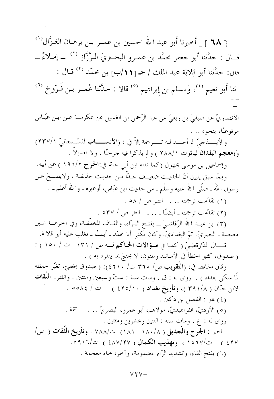 [68]- أَخبرنا أَبو عَبْدِ اللَّهِ الْحُسَيْنُ بْنُ عُمَرَ بْنِ بُرْهَانَ الغزَّال (¬1) قَالَ: حدَّثنا أَبُو جَعْفَرٍ محمَّد بن عمرو الْبَخْتَرِيُّ الرَّزَّاز (¬2) إِمْلَاءً قَالَ: حدَّثنا أبو قِلابَة عبد الملك/ج [11/ب] بْنُ محمَّد (¬3) قَالَ: ثنا أَبو نُعَيْمٍ (¬4) ، وَمسلم بْنُ إِبراهيم (¬5) قَالَا: حدَّثنا عُمر بن فَرّوخ (¬6)
