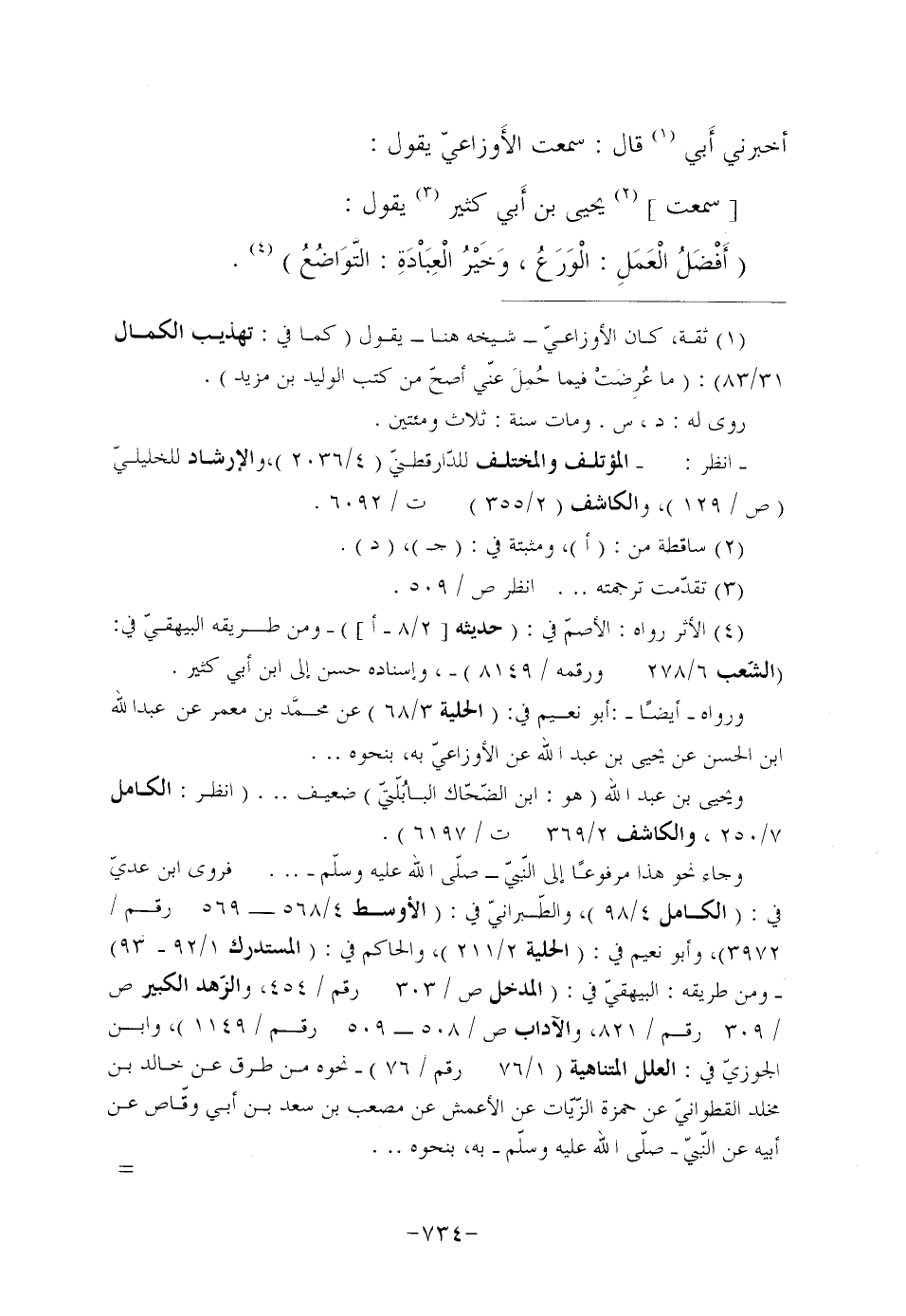 (¬4) الأثر رواه: الأصمّ في: (حديثه [2/8 أ] ) ومن طريقه البيهقيّ في: (الشّعب 6/278 ورقمه/8149) ، وإسناده حسن إلى ابن أبي كثير.