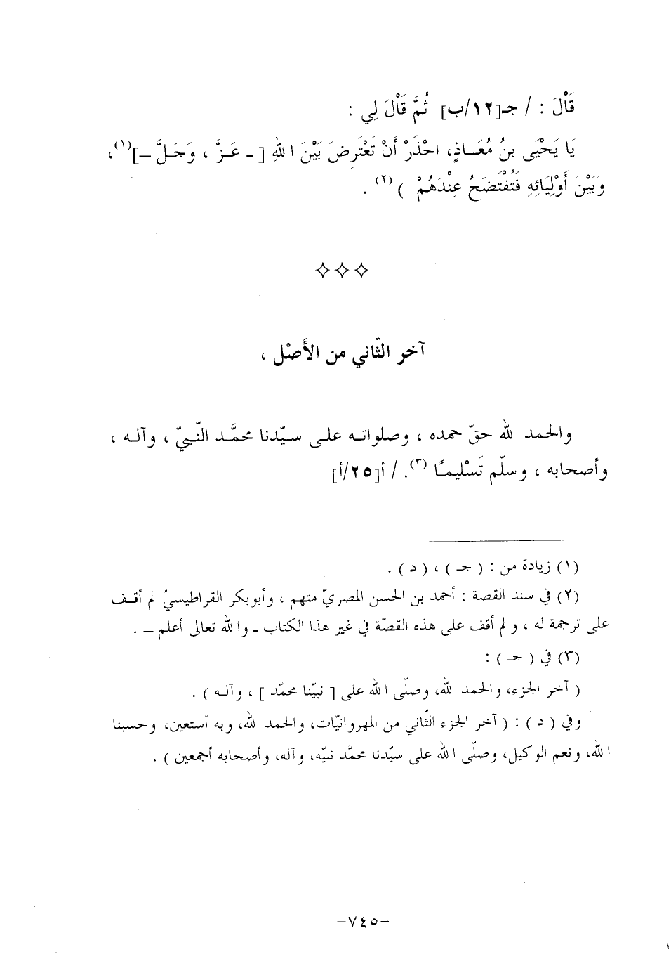 قَاْلَ:/ (ج [12/ب] ) ثُمَّ قَاْلَ لِي: يَا يَحْيَى بنُ مُعَاذٍ، احْذَرْ أَنْ تَعْتَرِضَ بَيْنَ اللهِ [عَزَّ، وَجَلَّ] (¬1) ، وَبَيْنَ أَوْلِيَائِهِ فَتُفْتَضَحُ عِنْدَهُمْ" (¬2) .
