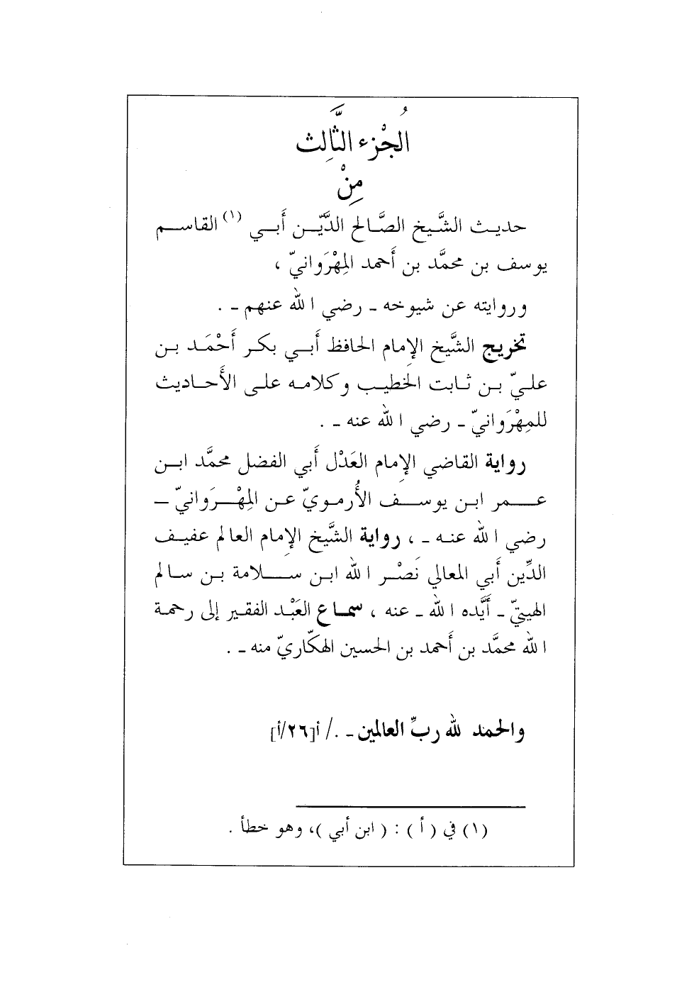 رواية القاضي الإِمام العَدْل أَبي الفضل محمَّد ابن عمر ابن يوسف الأُرمويّ عن المِهْرَوانيّ رضي الله عنه، رواية الشَّيخ الإِمام العالم عفيف الدِّين أَبي المعالي نَصْر الله ابن سلامة بن سالم الهيتيّ أَيَّده الله عنه، سماع العَبْد الفقير إلى رحمة الله محمَّد بن أَحمد بن الحسين الهكّاريّ منه.