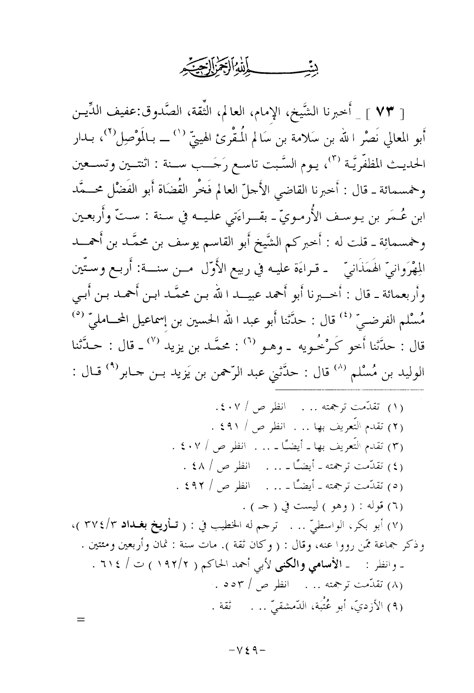 [73]- أَخبرنا الشَّيخ، الإِمام، العالم، الثِّقة، الصَّدوق: عفيف الدِّين أَبو المعالي نَصْر الله بن سَلامة بن سَالم المُقْرئ الهيتيّ (¬1) بالمَوْصِل (¬2) ، بدار الحديث المظفَّريَّة (¬3) ، يوم السَّبت تاسع رَجَب سنة: اثنتين وتسعين وخمسمائة قال: أَخبرنا القاضي الأَجلّ العالم فَخْر القُضَاة أَبو الفَضْل محمَّد ابن عُمَر بن يوسف الأُرمويّ بقراءَتي عليه في سنة: ستّ وأَربعين وخمسمائِة قلت له: أَخبركم الشَّيخ أَبو القاسم يوسف بن محمَّد بن أَحمد المِهْرَوانيّ الهَمَذَانيّ قراءَة عليه في ربيع الأَوّل من سنة: أَربع وستّين وأَربعمائة قَالَ: أَخبرنا أَبو أَحمد عُبَيْدُ الله بن محمَّد ابن أَحمد بْنِ أَبي مُسْلم الْفَرَضِيُّ (¬4) قَالَ: حدَّثنا أَبو عَبْدِ اللَّهِ الْحُسَيْنُ بْنُ إِسماعيل الْمَحَامِلِيُّ (¬5) قَالَ: حدَّثنا أَخو كَرْخُويه وَهُوَ (¬6) : محمَّد بْنُ يَزِيدَ (¬7) قَالَ: حدَّثنا الْوَلِيدُ بْنُ مُسْلم (¬8) قَالَ: حدَّثني عَبْدُ الرَّحْمَنِ بْنُ يَزيد بْنِ جَابِرٍ (¬9) قال: