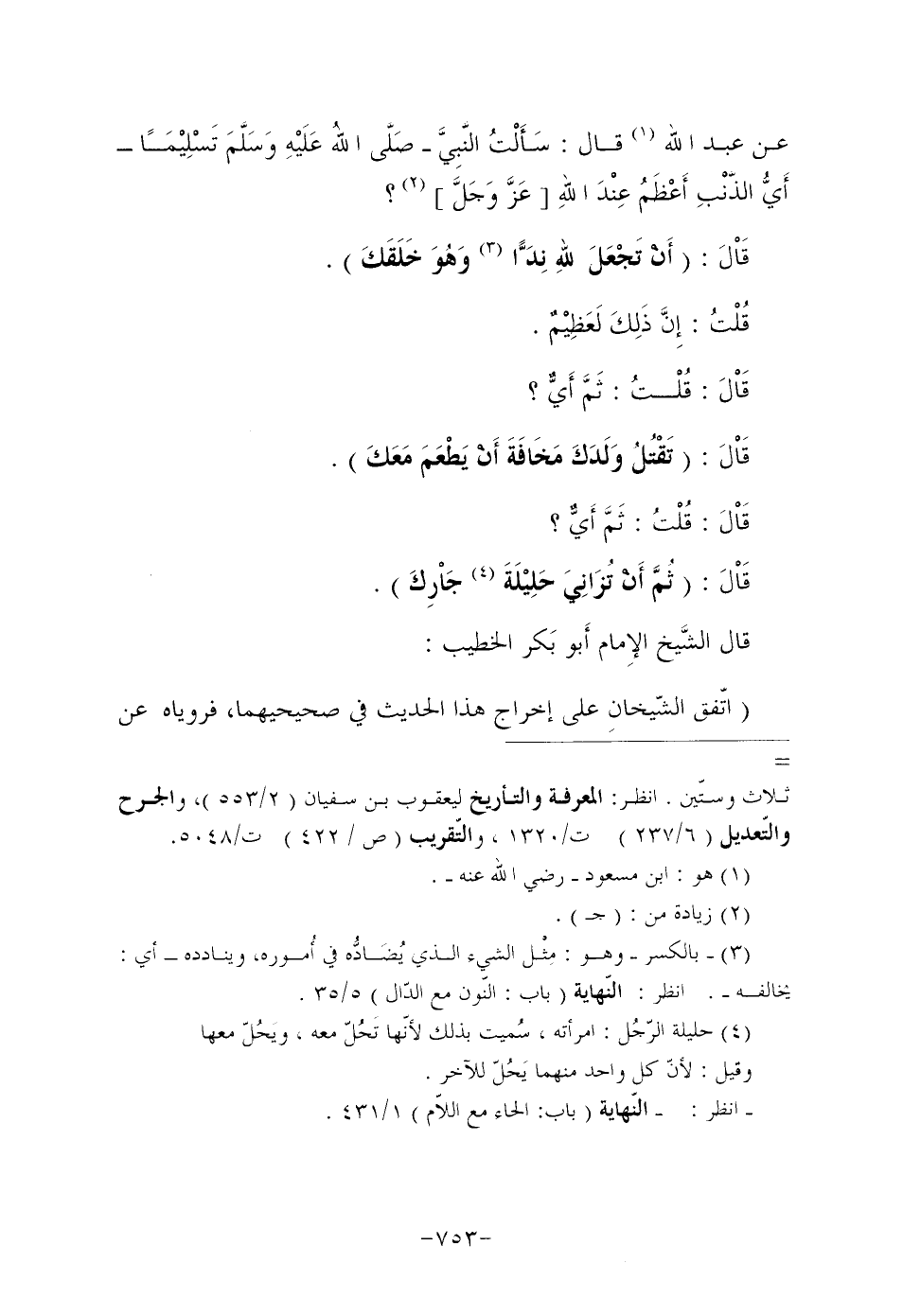 عَنْ عَبْدِ اللَّهِ (¬1) قَالَ: سَأَلْتُ النَّبِيَّ صَلَّى اللهُ عَلَيْهِ وَسَلَّمَ تَسْلِيْمَا أَيُّ الذَّنْبِ أَعْظَمُ عِنْدَ اللهِ [عَزَّ وَجَلَّ] (¬2) ؟ قَاْلَ: "أَنْ تَجْعَلَ للهِ نِدًَّا (¬3) وَهُوَ خَلَقَكَ". قُلْتُ: إِنَّ ذَلِكَ لَعَظِيْمٌ. قَاْلَ: قُلْتُ: ثَمَّ أَيٌّ؟ قَاْلَ: "تَقْتُلُ وَلَدَكَ مَخَافَةَ أَنْ يَطْعَمَ مَعَكَ". قَاْلَ: قُلْتُ: ثَمَّ أَيٌّ؟ قَاْلَ: "ثُمَّ أَنْ تُزَانِيَ حَلِيْلَةَ (¬4) جَاْرِكَ".