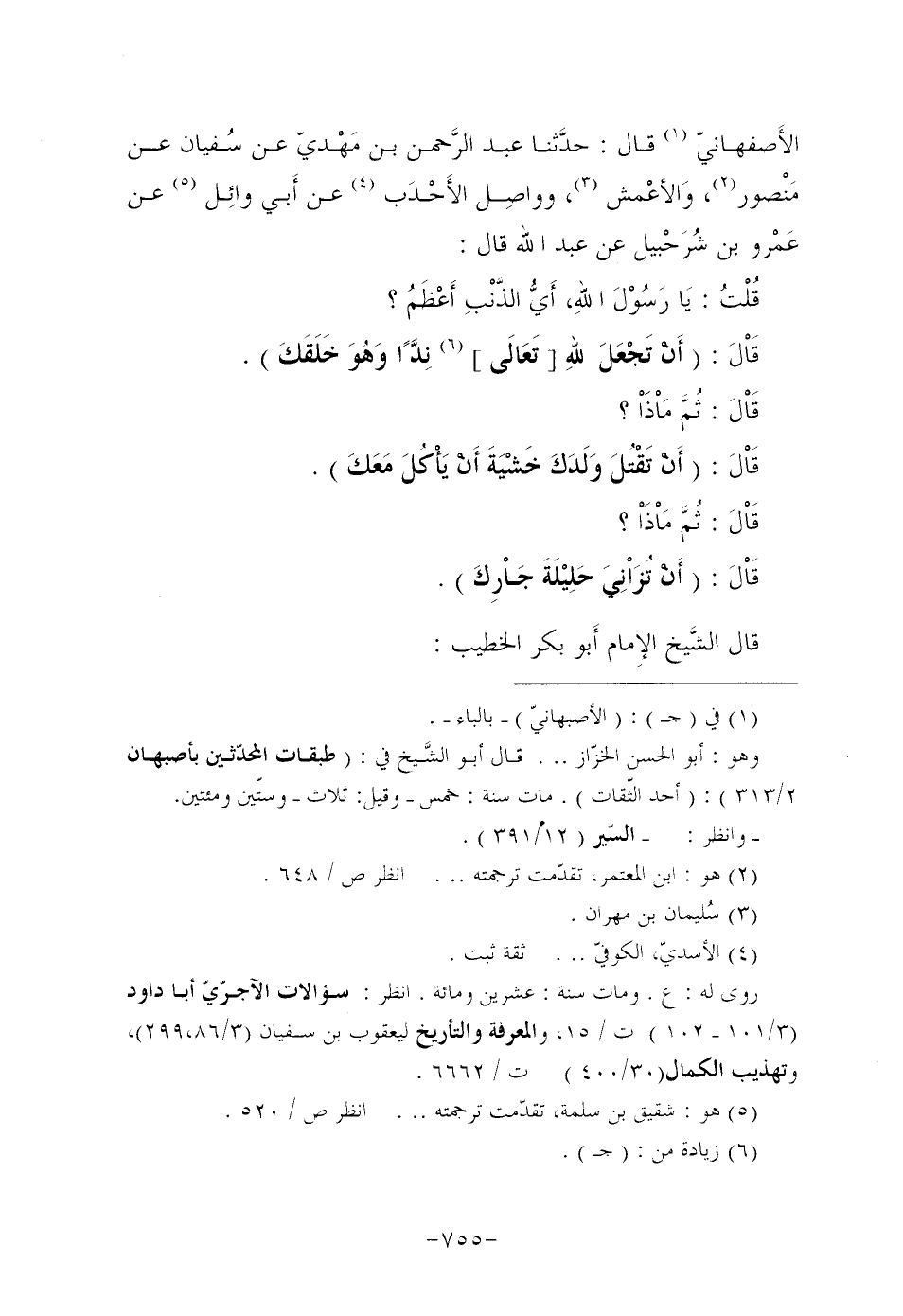 الأَصفهانيّ (¬1) قَالَ: حدَّثنا عَبْدُ الرَّحمن بْنُ مَهْديّ عَنْ سُفيان عَنْ مَنْصور (¬2) ، وَالأعْمش (¬3) ، وواصِل الأَحْدَب (¬4) عَنْ أَبي وائِل (¬5) عَنْ عَمْرو بْنِ شُرَحْبيل عَنْ عَبْدِ اللَّهِ قَالَ: قُلْتُ: يَا رَسُوْلَ اللهِ، أَيُّ الذَّنْبِ أَعْظَمُ؟ قَاْلَ: "أَنْ تَجْعَلَ للهِ [تَعَالَى] (¬6) نِدًَّا وَهُوَ خَلَقَكَ". قَاْلَ: ثُمَّ مَاْذَاْ؟ قَاْلَ: "أَنْ تَقْتُلَ وَلَدَكَ خَشْيَةَ أَنْ يَأْكُلَ مَعَكَ". قَاْلَ: ثُمَّ مَاْذَاْ؟ قَاْلَ: "أَنْ تُزَاْنِيَ حَلِيْلَةَ جَاْرِكَ".