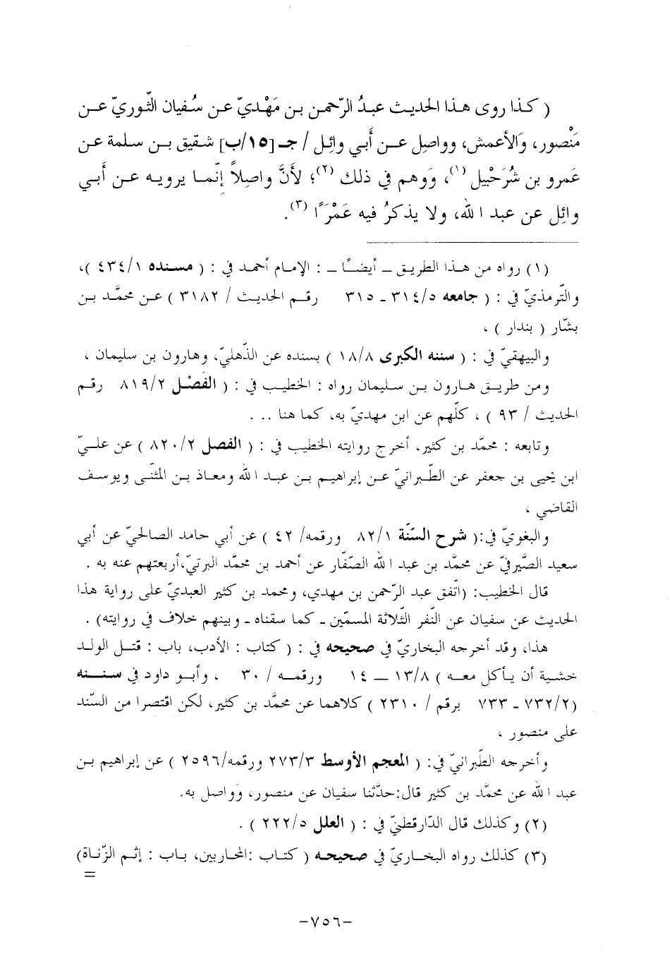 ورواه الخطيب أيضا في: (الفصل 2/835، وأشار إليه ص/823) من حديث مالك بن مغول، وأشار إليه (2/823) من حديث سعيد بن مسروق، كلّهم عن واصل عن أبي وائل عن عبد الله كما رواه يحيى عن الثّوريّ عن واصل.