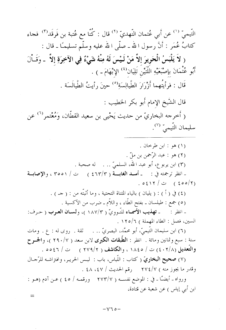 التَّيْمِيِّ (¬1) عَنْ أَبي عُثمان النَّهْدِيِّ (¬2) قَالَ: كُنَّا مَعَ عُتبة بْنِ فَرقَد (¬3) فَجَاءَ كتابُ عُمَر: أَنَّ رَسُولَ اللَّهِ صَلَّى اللَّهُ عَلَيْهِ وَسَلَّمَ تَسْلِيمًا قَالَ: "لاَ يَلْبَسُ الْحَرِيرَ إِلاَّ مَنْ لَيْسَ لَهُ مِنْهُ شَيْءٌ فِي الآخِرَةِ إِلاَّ" وَقَاْلَ أَبُو عُثْمَانَ بِإِصْبَعَيْهِ اللَّتَيْنِ تَلِيَانِ (¬4) الإِبْهَامَ.