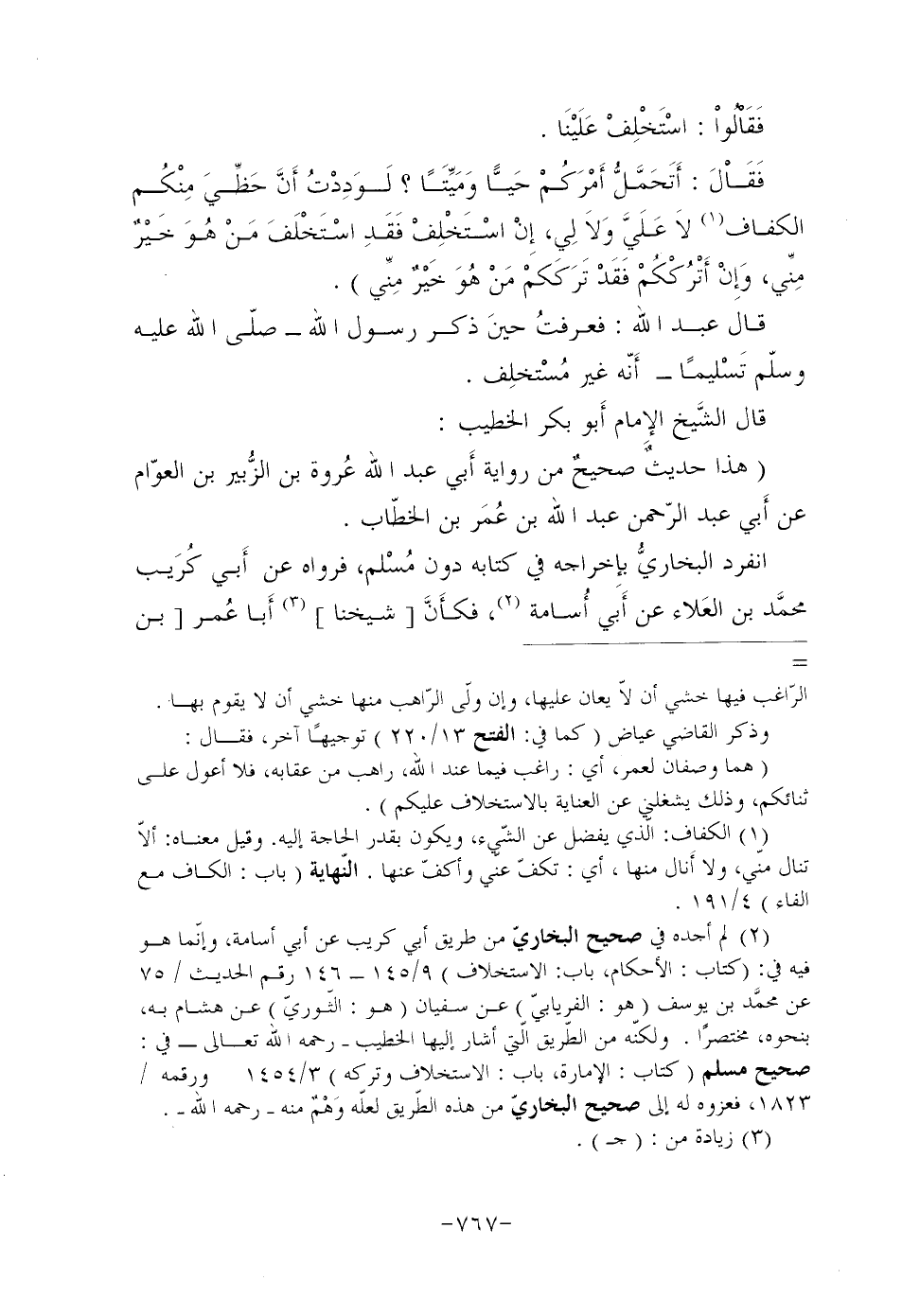 (¬2) لم أجده في صحيح البخاريّ من طريق أبي كريب عن أبي أسامة، وإنّما هو فيه في: (كتاب: الأحكام، باب: الاستخلاف) 9/145- 146 رقم الحديث/75 عن محمَّد بن يوسف (هو: الفريابيّ) عن سفيان (هو: الثّوريّ) عن هشام به، بنحوه، مختصرًا. ولكنّه من الطّريق الّتي أشار إليها الخطيب رحمه الله تعالى في: صحيح مسلم (كتاب: الإمارة، باب: الاستخلاف وتركه) 3/1454 ورقمه/1823، فعزوه له إلى صحيح البخاريّ من هذه الطّريق لعلّه وَهْمٌ منه رحمه الله.