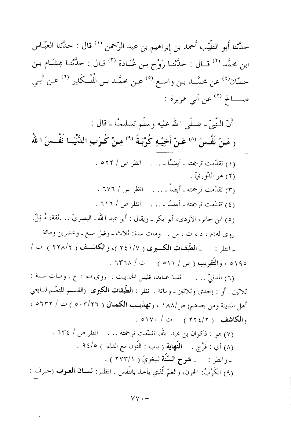 حدَّثنا أَبو الطَّيِّبِ أَحمد بْنُ إِبراهيم بْنِ عَبْدِ الرَّحْمَنِ (¬1) قَالَ: حدَّثنا العبّاس ابن محمَّد (¬2) قال: حدَّثنا رَوْح بن عُبَادة (¬3) قال: حدَّثنا هِشَام بْنِ حَسَّانٍ (¬4) عَنْ محمَّد بن واسع (¬5) عن محمَّد بن المُنْكَدِر (¬6) عَنْ أَبي صَالِحٍ (¬7) عَنْ أَبِي هُرَيْرَةَ: