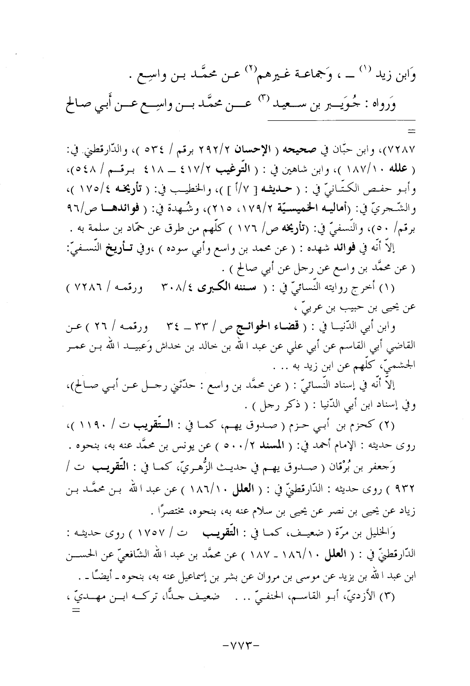(¬1) وَابن زَيْدٍ (¬2) ، وَجماعة غَيْرُهُمْ (¬3) عَنْ محمَّد بْنِ واسِع. وَرواه: جُوَيبر بْنُ سَعِيدٍ (¬4) عَنْ محمَّد بْنِ واسِع عن أَبي صالح