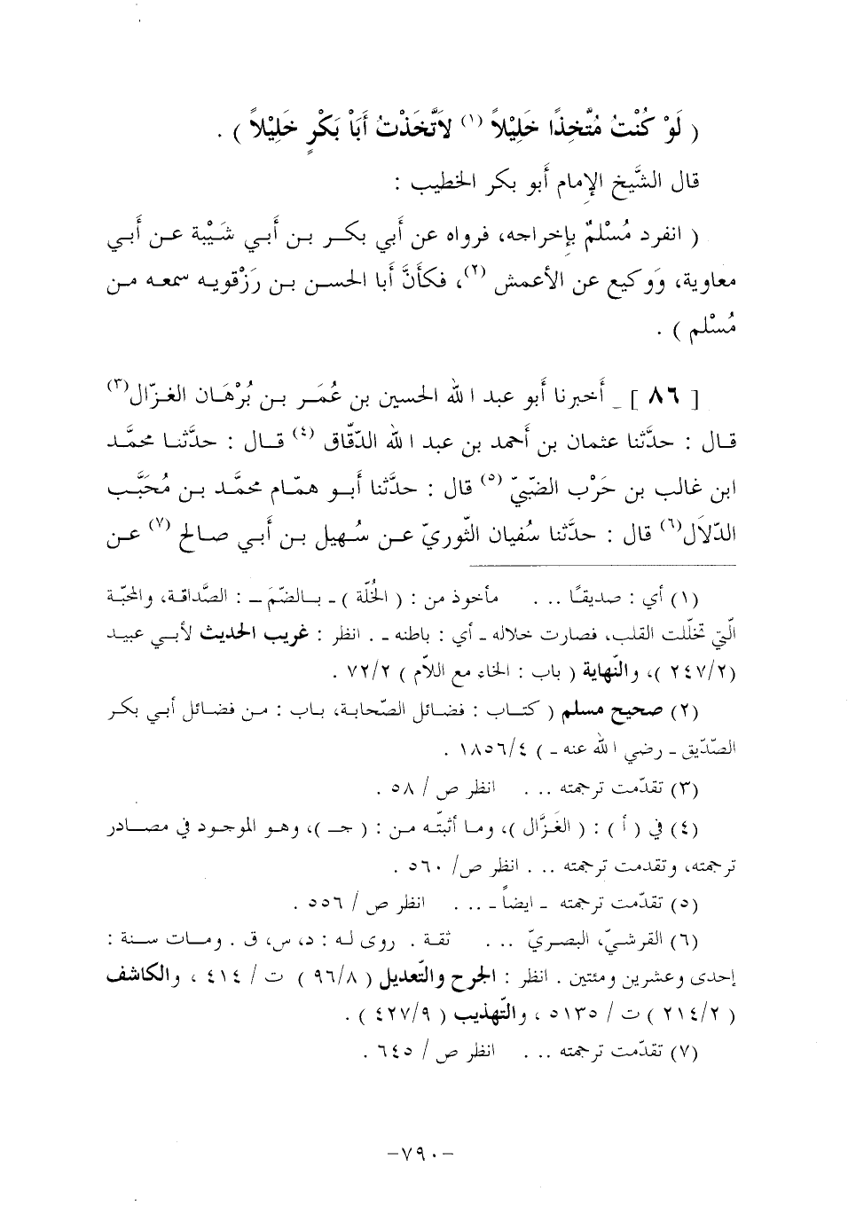 [86]- أَخبرنا أَبو عَبْدِ اللَّهِ الْحُسَيْنُ بْنُ عُمَر بْنِ بُرْهَان الْغَزَّالُ (¬3) قَالَ: حدَّثنا عُثْمَانُ بْنُ أَحمد بْنِ عَبْدِ الله الدّقّاق (¬4) قال: حدَّثنا محمَّد ابن غَالِبِ بْنِ حَرْب الضَّبِّيُّ (¬5) قَالَ: حدَّثنا أَبو هَمَّامٍ محمَّد بْنُ مُحَبَّب الدّلاَل (¬6) قَالَ: حدَّثنا سُفيان الثّوريّ عَنْ سُهيل بْنِ أَبي صَالِحٍ (¬7) عن