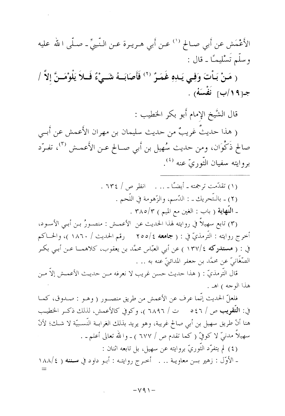 قَالَ الشَّيخ الإِمام أَبو بَكْرٍ الْخَطِيبُ: "هَذَا حديثٌ غريبٌ مِنْ حَدِيثِ سُلَيْمَانَ بْنِ مِهْرَانَ الأَعمش عَنْ أَبي صَالِحٍ ذَكْوَان، وَمِنْ حَدِيثِ سُهيل بْنِ أَبي صَالِحٍ عَنِ الأَعمش (¬3) ، تَفَرَّدَ بِرِوَايَتِهِ سفيان الثّوريّ عنه (¬4) .