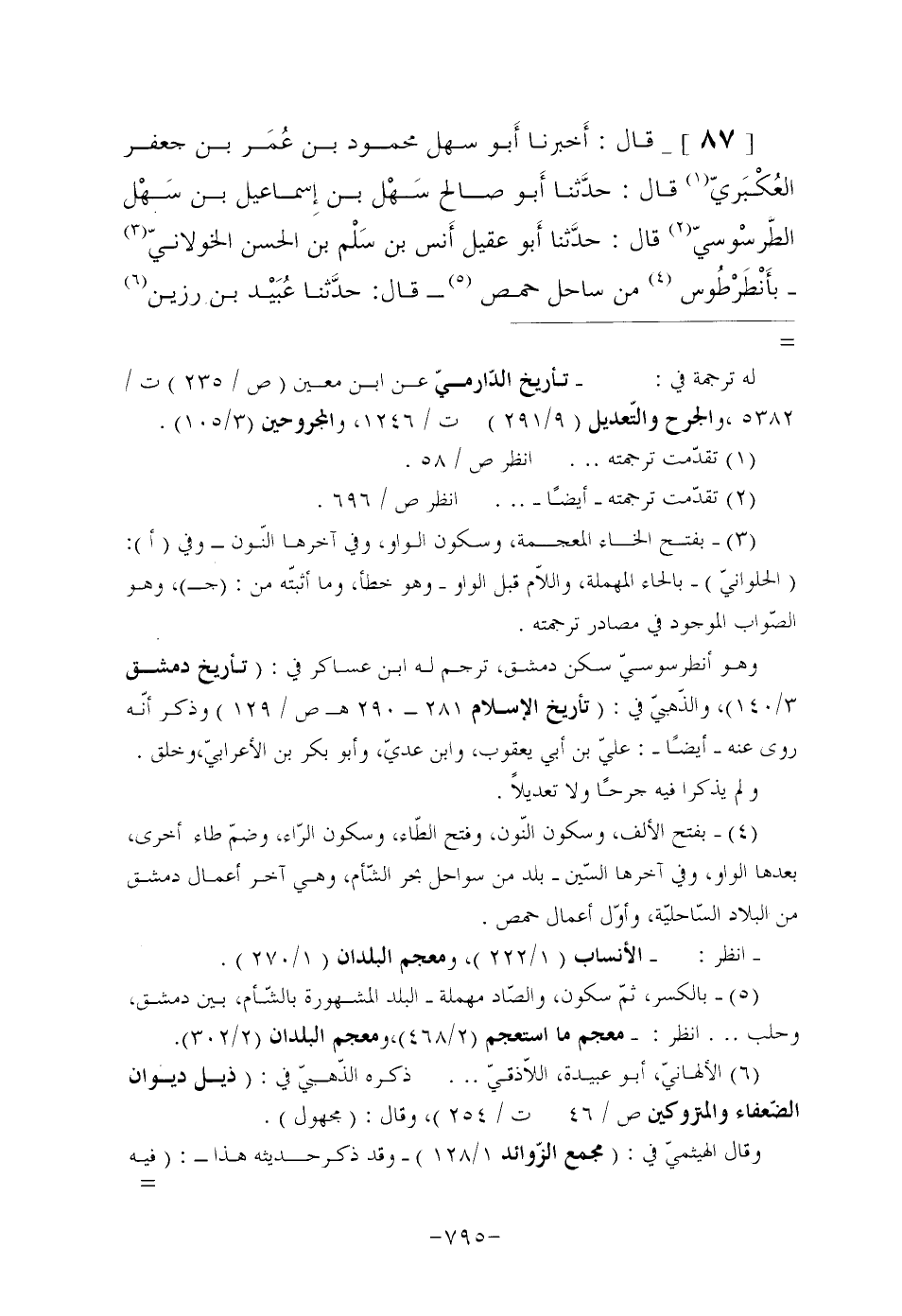 [87]- قال: أَخبرنا أَبو سَهْلٍ مَحْمُودُ بْنُ عُمَر بْنِ جَعْفَرٍ العُكْبَريّ (¬1) قَالَ: حدَّثنا أَبو صَالِحٍ سَهْل بْنُ إِسماعيل بْنِ سَهْل الطَّرسْوسيّ (¬2) قَالَ: حدَّثنا أَبو عُقَيْلٍ أَنس بْنُ سَلْم بن الحسن الخولانيّ (¬3) بأَنْطَرْطُوس (¬4) مِنْ سَاحِلِ حِمْصَ (¬5) قَالَ: حدَّثنا عُبَيْد بن رزين (¬6)