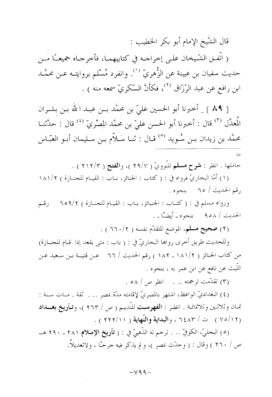 قَالَ الشَّيخ الْإِمَامُ أَبُو بَكْرٍ الْخَطِيبُ: "اتَّفَقَ الشَّيْخَانِ عَلَى إِخْرَاجِهِ فِي كِتَابَيْهِمَا، فَأَخْرَجَاهُ جَمِيعًا مِنْ حَدِيثِ سُفْيَانَ بْنِ عُيْيَنَةَ عَنِ الزُّهريّ (¬1) . وَانْفَرَدَ مُسْلم بِرِوَايَتِهِ عَنْ محمَّد ابن رَافِعٍ عَنْ عَبْدِ الرَّزَّاقِ (¬2) ، فكأَنَّ السُّكَّرِيَّ سَمِعَهُ مِنْهُ".