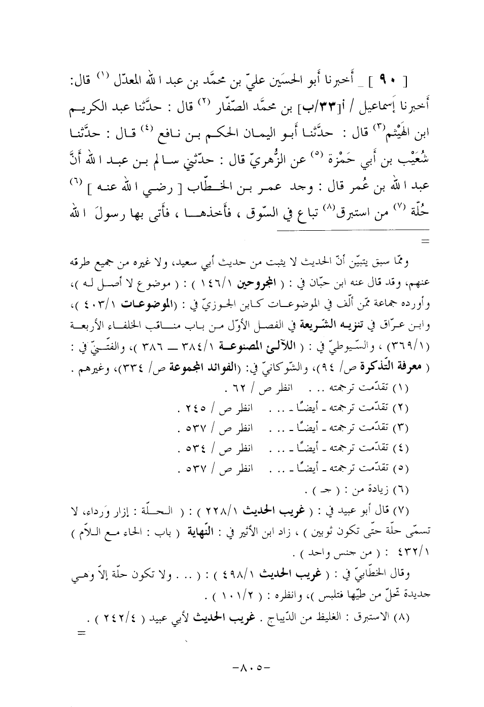 [90]- أَخبرنا أَبو الحسَين عَلِيُّ بْنُ محمَّد بْنِ عَبْدِ اللَّهِ الْمُعَدَّلُ (¬1) قال: أَخبرنا إَسماعيل/ (أ [33/ب] ) بْنُ محمَّد الصَّفَّارُ (¬2) قَالَ: حدَّثنا عبد الكريم ابن الهَيْثم (¬3) قَالَ: حدَّثنا أَبو الْيَمَانِ الْحَكَمُ بْنُ نَافِعٍ (¬4) قَالَ: حدَّثنا شُعَيْب بْنُ أَبي حَمْزة (¬5) عَنِ الزُّهريّ قَالَ: حَدَّثَنِي سَالِمُ بْنُ عَبْدِ اللَّهِ أَنَّ عَبْدَ اللَّهِ بْنَ عُمر قَالَ: وَجَدَ عُمَرُ بن الخطّاب [رضي الله عنه] (¬6) حُلَّة (¬7) مِنْ إِسْتَبَرَقٍ (¬8) تُبَاعُ فِي السُّوقِ، فأَخذها، فأَتى بِهَا رسولَ الله