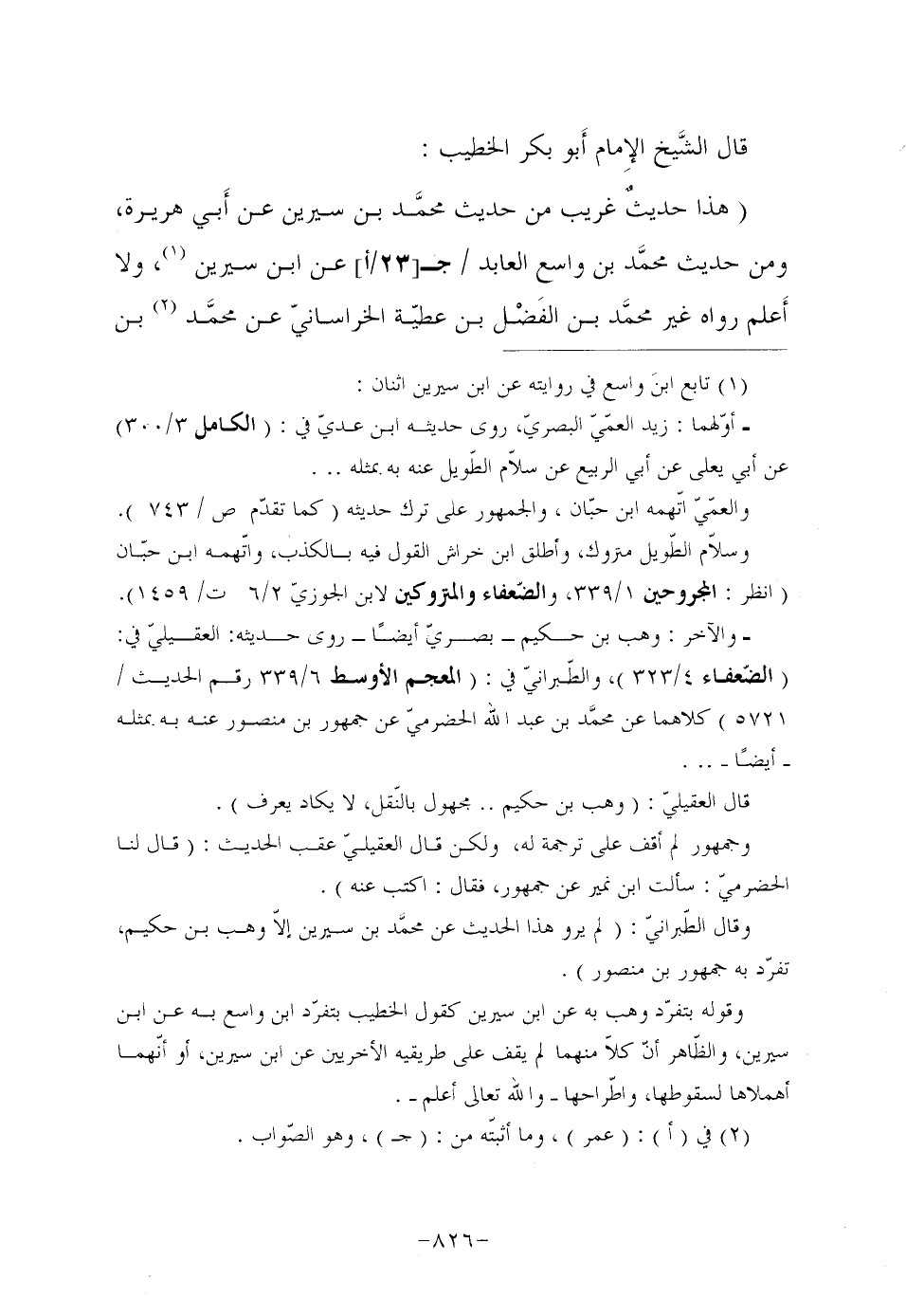 وقوله بتفرّد وهب به عن ابن سيرين كقول الخطيب بتفرّد ابن واسع به عن ابن سيرين، والظّاهر أنّ كلاّ منهما لم يقف على طريقيه الأخريين عن ابن سيرين، أو أنّهما أهملاها لسقوطها، واطّراحها والله تعالى أعلم.