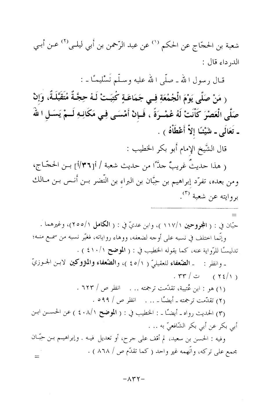 شُعْبَةُ بْنُ الْحَجَّاجِ عَنِ الْحَكَمِ (¬1) عَنْ عَبْدِ الرَّحْمَنِ بْنِ أَبي لَيْلَى (¬2) عَنْ أَبِي الدَّرْدَاءِ قَالَ: قَالَ رَسُولُ اللَّهِ صَلَّى اللَّهُ عَلَيْهِ وَسَلَّمَ تَسْليما: "مَنْ صَلَّى يَوْمَ الْجُمُعَةِ فِي جَمَاعَةٍ كُتِبَتْ لَهُ حِجَّةٌ مُتَقَبَّلَةٌ، وَإِنْ صَلَّى الْعَصْرَ كَاْنَتْ لَهُ عُمْرَةً، فَإِنْ أَمْسَى فِي مَكَانِهِ لَمْ يَسَلِ اللهَ تَعَالَى شَيْئا إِلاَّ أَعْطَاْهُ".