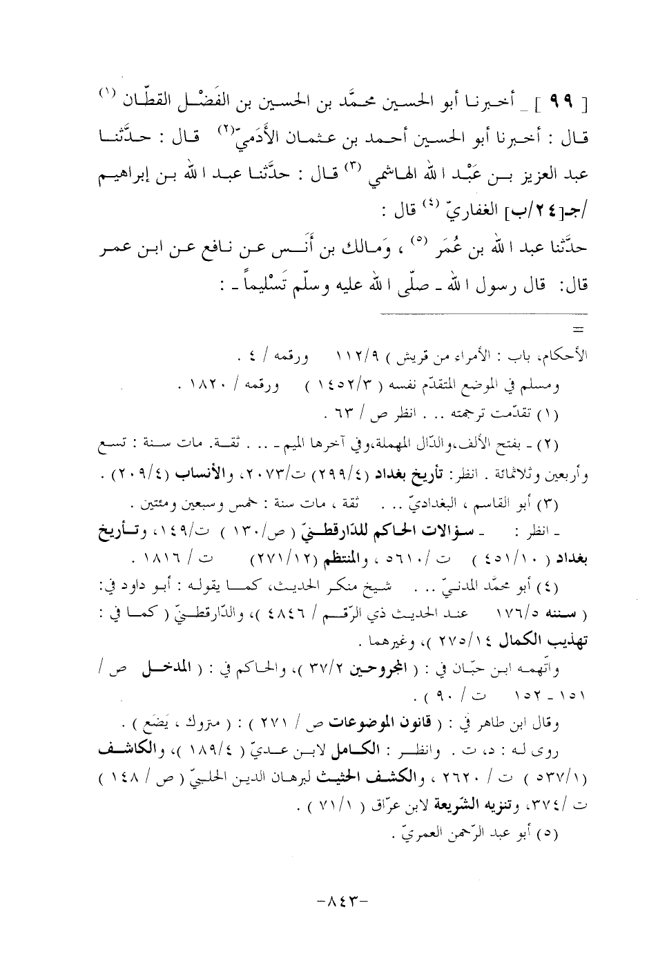 [99]- أَخْبَرَنَا أَبُو الْحُسَيْنِ محمَّد بْنُ الحسين بْنِ الفَضْل الْقَطَّانُ (¬1) قَالَ: أَخْبَرَنَا أَبُو الْحُسَيْنِ أَحْمَدُ بْنُ عُثْمَانَ الأَدَميّ (¬2) قَالَ: حدَّثنا عَبْدُ الْعَزِيزِ بْنُ عَبْد اللَّهِ الْهَاشِمِيُّ (¬3) قَالَ: حدَّثنا عَبْدُ اللَّهِ بْنُ إِبْرَاهِيمَ/ (ج [24/ب] ) الغفاريّ (¬4) قَالَ: حدَّثنا عَبْدُ اللَّهِ بْنُ عُمَر (¬5) ، وَمالك بْنُ أَنَس عَنْ نَافِعٍ عَنِ ابْنِ عُمَرَ قَالَ: قَالَ رَسُولُ اللَّهِ صَلَّى اللَّهُ عليه وسلّم تَسْليماً: