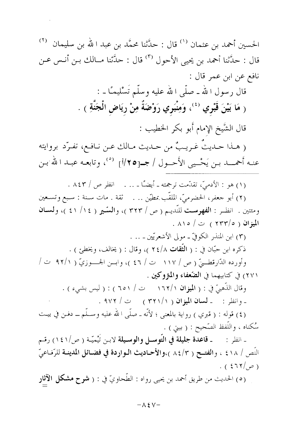 الْحُسَيْنِ أَحْمَدُ بْنُ عُثْمَانَ (¬1) قَالَ: حدَّثنا محمَّد بْنُ عَبْدِ اللَّهِ بْنِ سُلَيْمَانَ (¬2) قَالَ: حدَّثنا أَحْمَدُ بْنُ يَحْيَى الْأَحْوَلُ (¬3) قَالَ: حدَّثنا مَالِكُ بْنُ أَنَسٍ عَنْ نَافِعٍ عَنِ ابْنِ عُمَرَ قَالَ: قَالَ رَسُولَ اللَّهِ صَلَّى اللَّهُ عَلَيْهِ وَسَلَّمَ تَسْليما: "مَا بَيْنَ قَبْرِي (¬4) ، وَمِنْبَرِي رَوْضَةٌ مِنْ رِيَاضِ الْجَنَّةِ".