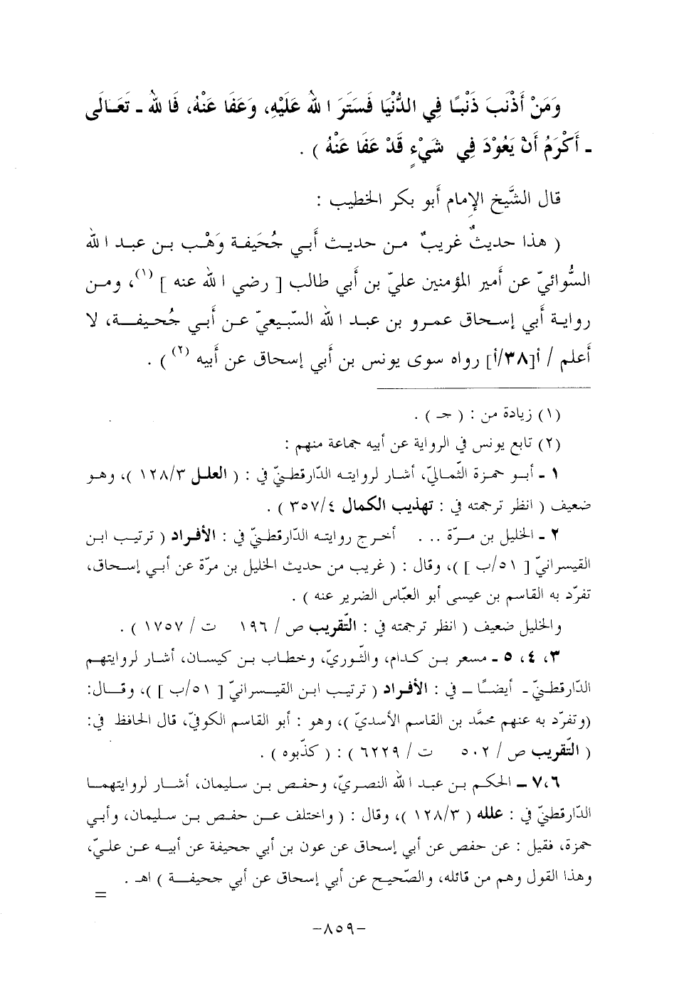 قَالَ الشَّيخ الإِمام أَبو بَكْرٍ الْخَطِيبُ: "هَذَا حديثٌ غريبٌ مِنْ حَدِيثِ أَبي جُحَيفة وَهْب بْنِ عَبْدِ اللَّهِ السُّوائيّ عَنْ أَمير الْمُؤْمِنِينَ عَلِيِّ بْنِ أَبي طَالِبٍ [رضي الله عنه] (¬1) ، وَمِنْ رِوَايَةِ أَبي إِسْحَاقَ عَمْرِو بْنِ عَبْدِ اللَّهِ السَّبِيعِيِّ عَنْ أَبي جُحيفة، لا أَعلم/ (أ [38/أ] ) رَوَاهُ سِوَى يُونُسُ بْنُ أَبي إسحاق عن أَبيه (¬2) ".