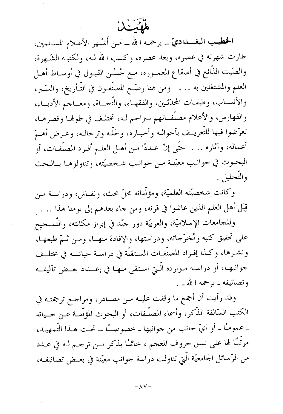 الخطيب البغداديّ يرحمه الله من أَشْهر الأعلام المسلمين، طارت شهرته في عصره، وبعد عصره، وكتب الله له، ولكتبه الشّهرة، والصّيت الذّائع في أصقاع المعمورة، مع حُسْن القبول في أوساط أهل العلم والمشتغلين به ... ومن هنا رصّع المصنّفون في التّأريخ، والسّير، والأنساب، وطبقات المحدّثين، والفقهاء، والنّحاة، ومعاجم الأدباء، والفهارس، والأعلام مصنّفاتهم بتراجم له، تختلف في طولها وقصرها، تعرّضوا فيها للتّعريف بأحواله وأخباره، وحَلّه وترحاله، وعرض أهمّ أعماله، وآثاره ... حتّى إنّ عددًا من أهل العلم أفرد المصنّفات، أو البحوث في جوانب معيّنة من جوانب شخصيّته، وتناولوها بالبحث والتّحليل.