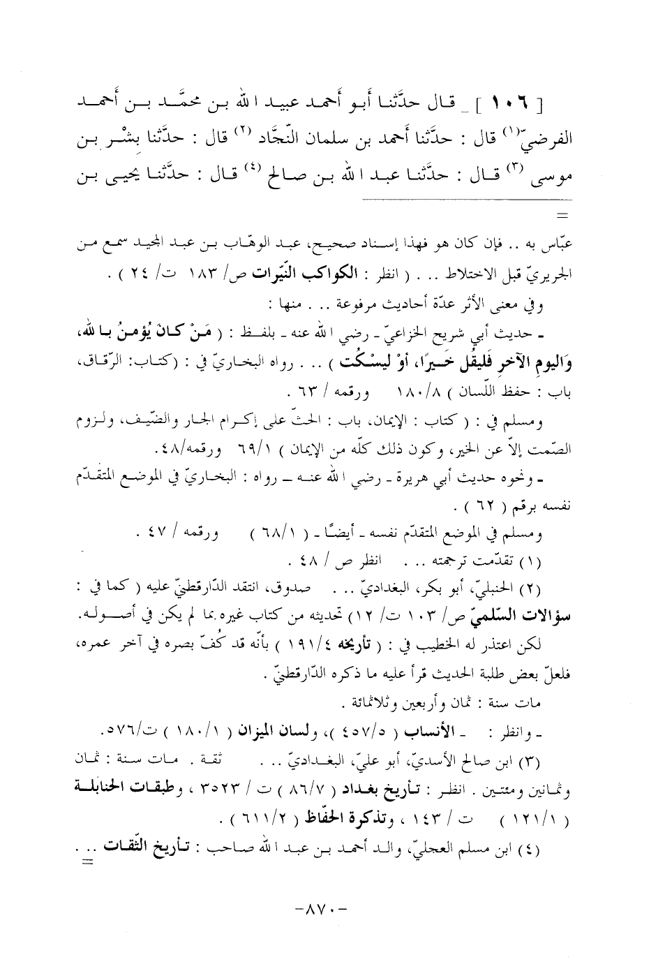 [106]- قَالَ حدَّثنا أَبو أَحمد عُبَيْدُ اللَّهِ بْنُ محمَّد بْنِ أَحمد الْفَرَضِيُّ (¬1) قَالَ: حدَّثنا أَحمد بْنُ سَلْمَانَ النَّجَّاد (¬2) قَالَ: حدَّثنا بِشْر بْنُ مُوسَى (¬3) قَالَ: حدَّثنا عَبْدُ اللَّهِ بْنُ صَالِحٍ (¬4) قَالَ: حدَّثنا يحيى بن