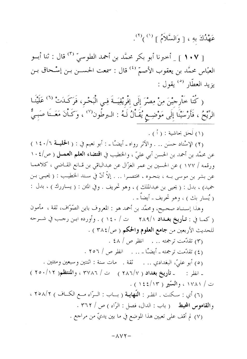 [107]- أَخْبَرَنَا أَبُو بَكْرٍ محمَّد بْنُ أَحْمَدَ الطُّوسِيُّ (¬3) قَالَ: ثنا أَبُو الْعَبَّاسِ محمَّد بْنُ يَعْقُوبَ الْأَصَمُّ (¬4) قَالَ: سَمِعْتُ الْحَسَنَ بْنَ إسْحاق بْنِ يَزِيدَ الْعَطَّارَ (¬5) يَقُولُ: "كُنَّا خَاْرِجِيْنَ مِنْ مِصْرَ إِلَى إِفْرِيْقِيَةَ فِي الْبَحْرِ، فَرَكَدَتْ (¬6) عَلَيْنَا الرِّيْحُ، فَأَرْسَيْنَا إِلَى مَوْضِعٍ يُقَاْلُ لَهُ: البرطُون (¬7) ، وَكَاْنَ مَعَنَا صَبِيٌّ