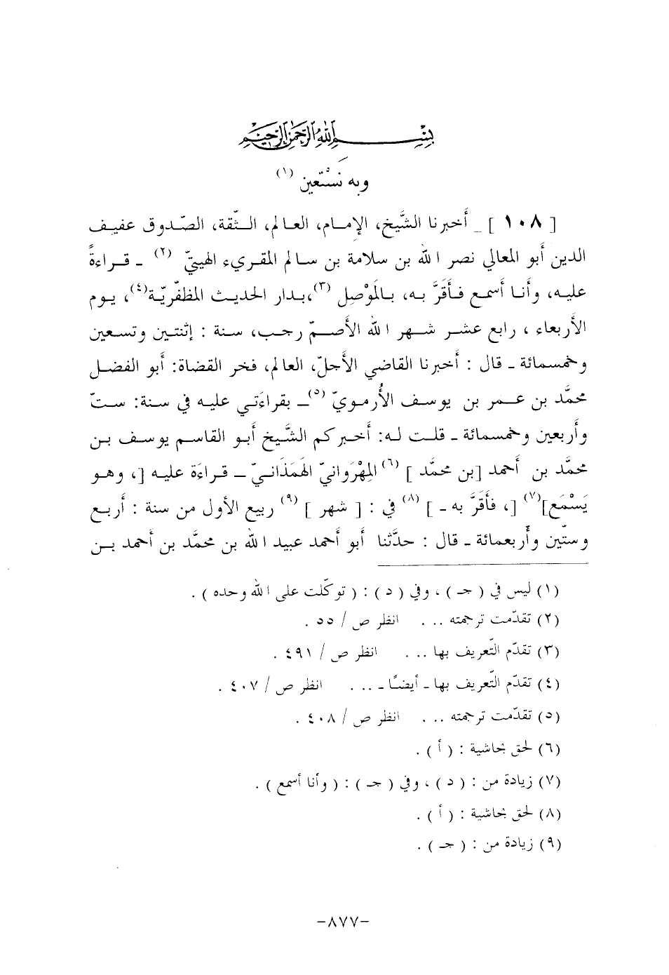 [108]- أَخبرنا الشَّيخ، الإِمام، العالم، الثّقة، الصّدوق عفيف الدين أَبو المعالي نصر الله بن سلامة بن سالم المقرئ الهيتيّ (¬2) قراءةً عليه، وأَنا أَسمع فأَقَرَّ به، بالمَوْصِل (¬3) ،بدار الحديث المظفّريّة (¬4) ، يوم الأَربعاء، رابع عشر شهر الله الأَصمّ رجب، سنة: إثنتين وتسعين وخمسمائة قال: أَخبرنا القاضي الأَجلّ، العالم، فخر القضاة: أَبو الفضل محمَّد بن عمر بن يوسف الأُرمويّ (¬5) بقراءَتي عليه في سنة: ستّ وأَربعين وخمسمائة قلت له: أَخبركم الشَّيخ أَبو القاسم يوسف بْنُ محمَّد بْنِ أَحمد [بْنِ محمَّد] (¬6) المِهْرَوانيّ الهَمَذَانيّ قراءَة عليه [وهو يَسْمَع] (¬7) [، فأَقَرَّ به] (¬8) في: [شهر] (¬9) ربيع الأول من سنة: أَربع وستّين وأّربعمائة قَالَ: حدَّثنا أَبو أَحمد عُبَيْدُ اللَّهِ بْنُ محمَّد بْنِ أَحمد بن