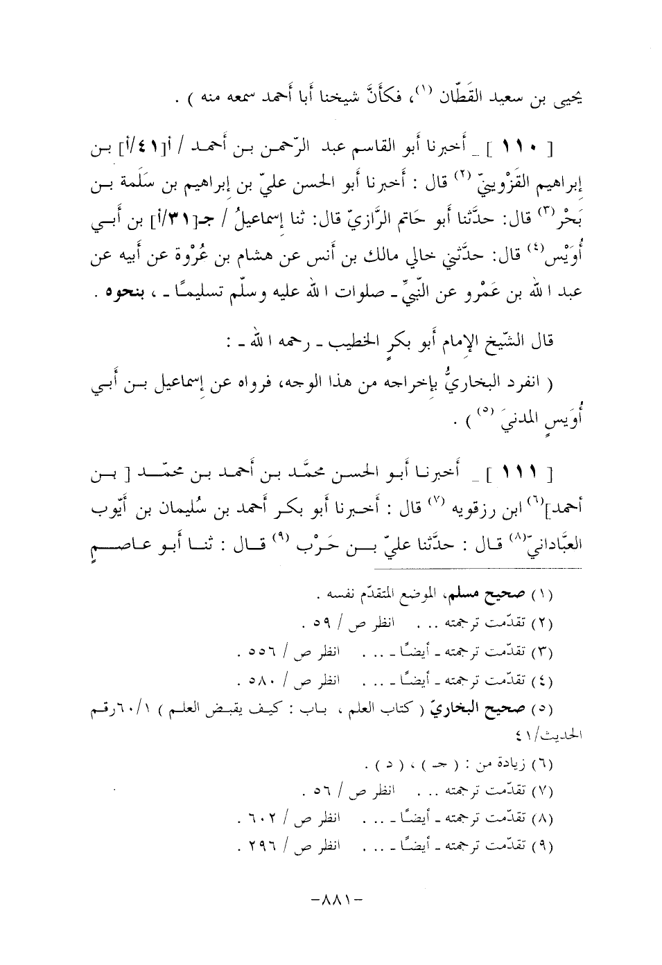 [110]- أَخبرنا أَبو الْقَاسِمِ عَبْدُ الرَّحْمَنِ بن أَحمد/ (أ [41/أ] ) بْنِ إِبراهيم القَزْوينيّ (¬2) قَالَ: أَخبرنا أَبو الْحَسَنِ عَلِيُّ بْنُ إِبراهيم بْنِ سَلَمة بْنِ بَحْر (¬3) قَالَ: حدَّثنا أَبو حَاتم الرَّازيّ قَالَ: ثنا إِسماعيلُ/ (ج [31/أ] ) بْنُ أَبي أُوَيْس (¬4) قَالَ: حدَّثني خَالِي مَالِكُ بْنُ أَنس عَنْ هِشَامِ بْنِ عُرْوة عَنْ أَبيه عَنْ عَبْدِ اللَّهِ بْنِ عَمْرو عَنِ النَّبيِّ صَلَوَاتُ اللَّهُ عَلَيْهِ وَسَلَّمَ تَسْلِيمًا، بِنَحْوِهِ.