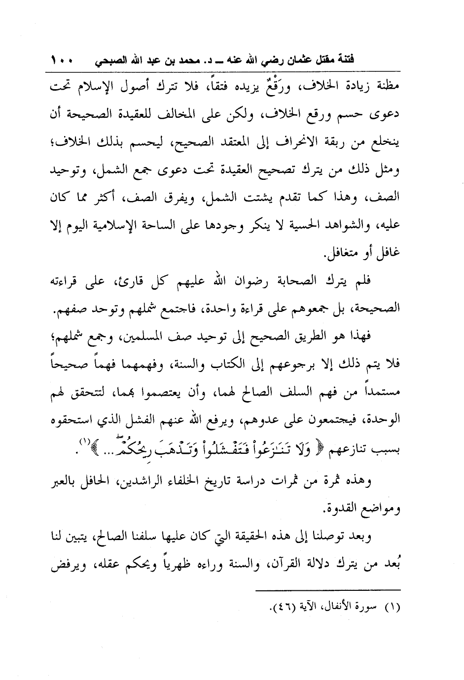فهذا هو الطريق الصحيح إلى توحيد صف المسلمين، وجمع شملهم؛ فلا يتم ذلك إلا برجوعهم إلى الكتاب والسنة، وفهمهما فهماً صحيحاً مستمداً من فهم السلف الصالح لهما، وأن يعتصموا بهما، لتتحقق لهم الوحدة، فيجتمعون على عدوهم، ويرفع الله عنهم الفشل الذي استحقوه بسبب تنازعهم {وَلا تَنَازَعُوا فَتَفْشَلُوا وَتَذْهَبَ رِيحُكُمْ} 1.