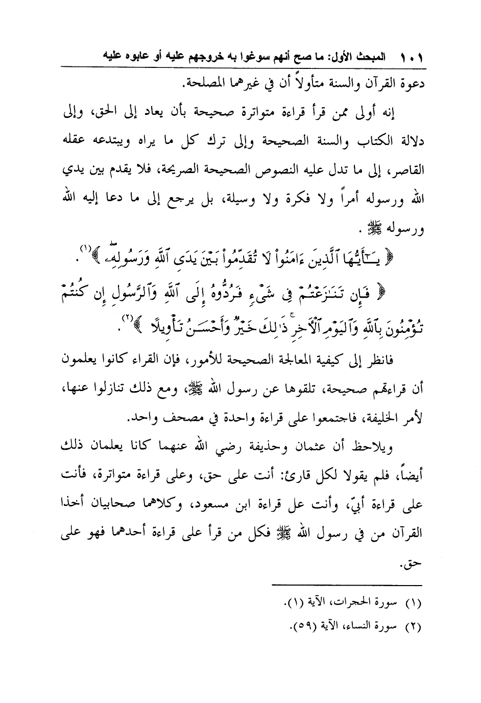 إنه أولى ممن قرأ قراءة متواترة صحيحة بأن يعاد إلى الحق، وإلى دلالة الكتاب والسنة الصحيحة وإلى ترك كل ما يراه ويبتدعه عقله القاصر، إلى ما تدل عليه النصوص الصحيحة الصريحة، فلا يقدم بين يدي الله ورسوله أمراً ولا فكرة ولا وسيلة، بل يرجع إلى ما دعا إليه الله ورسوله صلى الله عليه وسلم. {يَا أَيُّهَا الَّذِينَ آمَنُوا لا تُقَدِّمُوا بَيْنَ يَدَيِ اللَّهِ وَرَسُولِهِ} 1. {فَإِنْ تَنَازَعْتُمْ فِي شَيْءٍ فَرُدُّوهُ إِلَى اللَّهِ وَالرَّسُولِ إِنْ كُنْتُمْ تُؤْمِنُونَ بِاللَّهِ وَالْيَوْمِ الْآخِرِ ذَلِكَ خَيْرٌ وَأَحْسَنُ تَأْوِيلاً} 2.