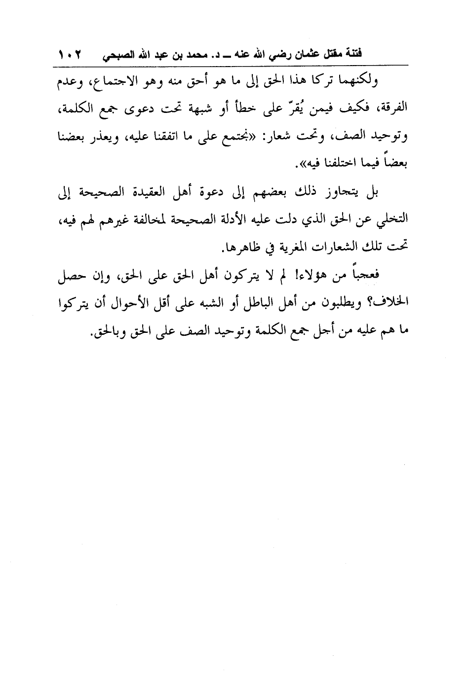 فعجباً من هؤلاء! لم لا يتركون أهل الحق على الحق، وإن حصل الخلاف؟ ويطلبون من أهل الباطل أو الشبه على أقل الأحوال أن يتركوا ما هم عليه من أجل جمع الكلمة وتوحيد الصف على الحق وبالحق.