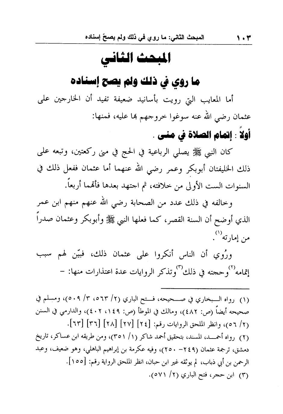 أما المعايب التي رويت بأسانيد ضعيفة تفيد أن الخارجين على عثمان رضي الله عنه سوغوا خروجهم بها عليه، فمنها: أولاً: إتمام الصلاة في منى.