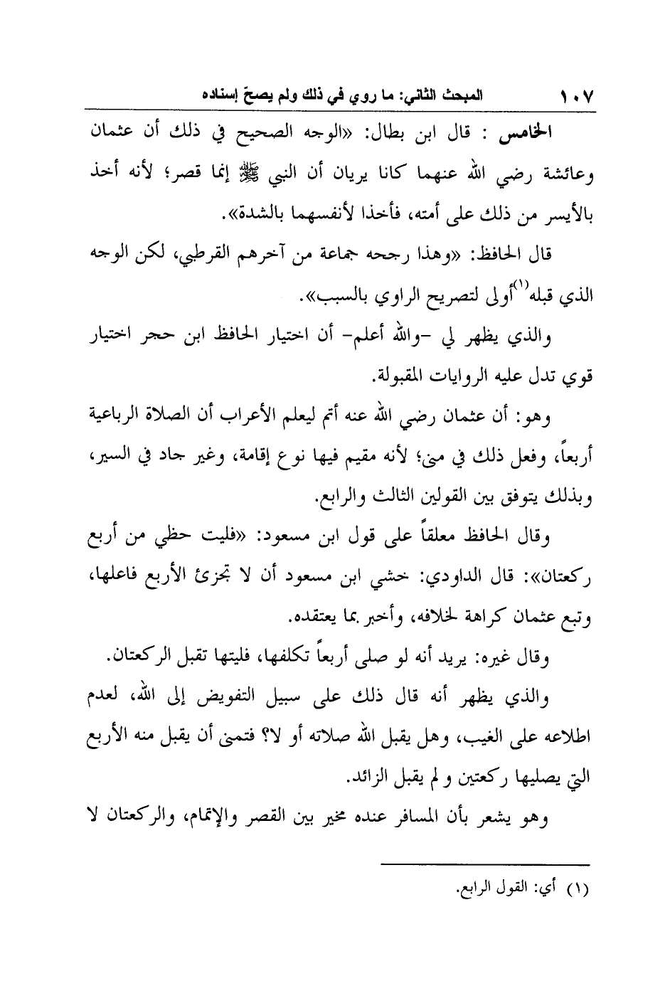 وهو: أن عثمان رضي الله عنه أتم ليعلم الأعراب أن الصلاة الرباعية أربعاً، وفعل ذلك في منى؛ لأنه مقيم فيها نوع إقامة، وغير جاد في السير، وبذلك يتوفق بين القولين الثالث والرابع.