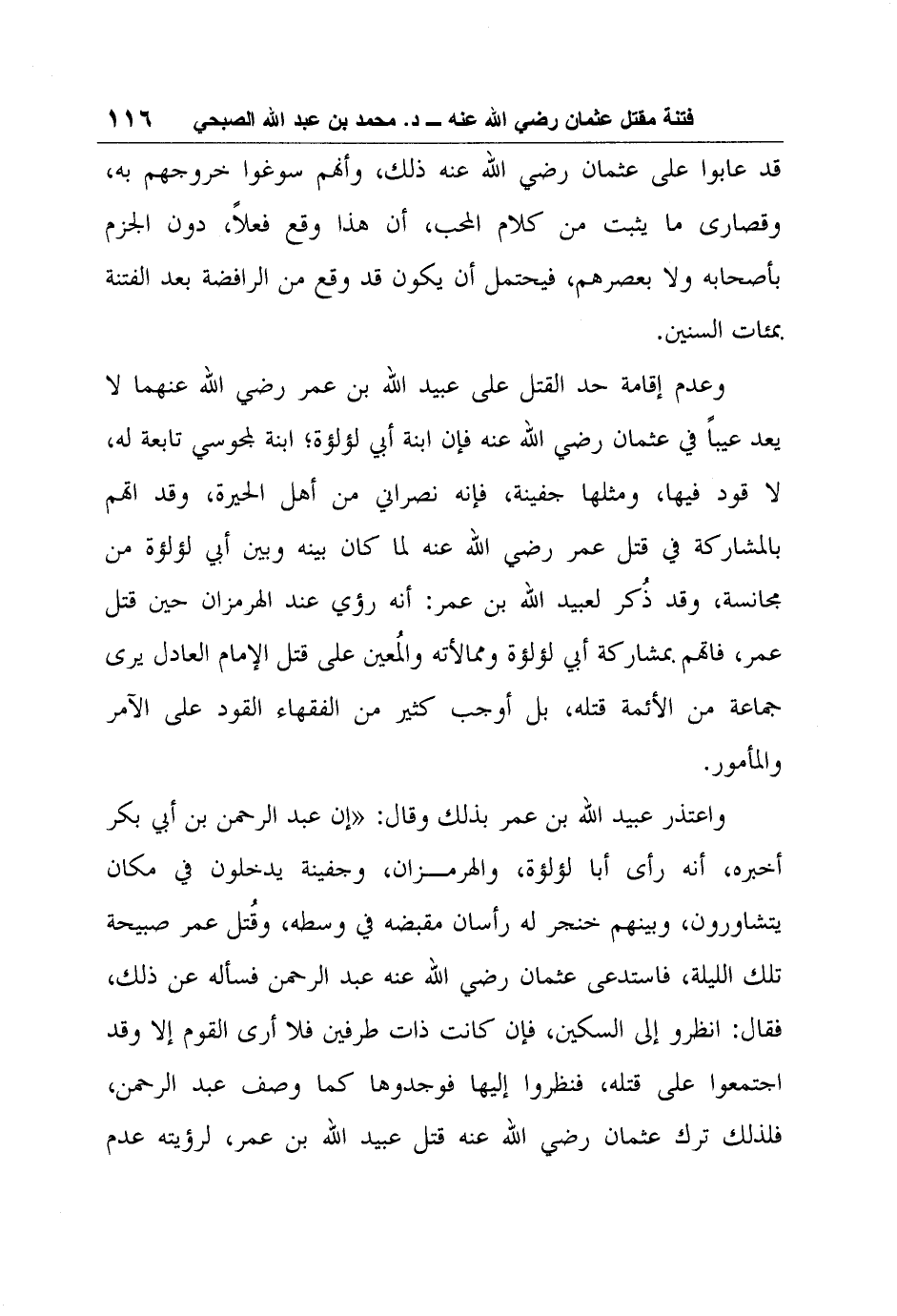وعدم إقامة حد القتل على عبيد الله بن عمر رضي الله عنهما لا يعد عيباً في عثمان رضي الله عنه فإن ابنة أبي لؤلؤة؛ ابنة لمجوسي تابعة له، لا قود فيها، ومثلها جفينة، فإنه نصراني من أهل الحيرة، وقد اتهم بالمشاركة في قتل عمر رضي الله عنه لما كان بينه وبين أبي لؤلؤة من مجانسة، وقد ذُكر لعبيد الله بن عمر: أنه رؤي عند الهرمزان حين قتل عمر، فاتهم بمشاركة أبي لؤلؤة وممالأته والمُعين على قتل الإمام العادل يرى جماعة من الأئمة قتله، بل أوجب كثير من الفقهاء القود على الآمر والمأمور.