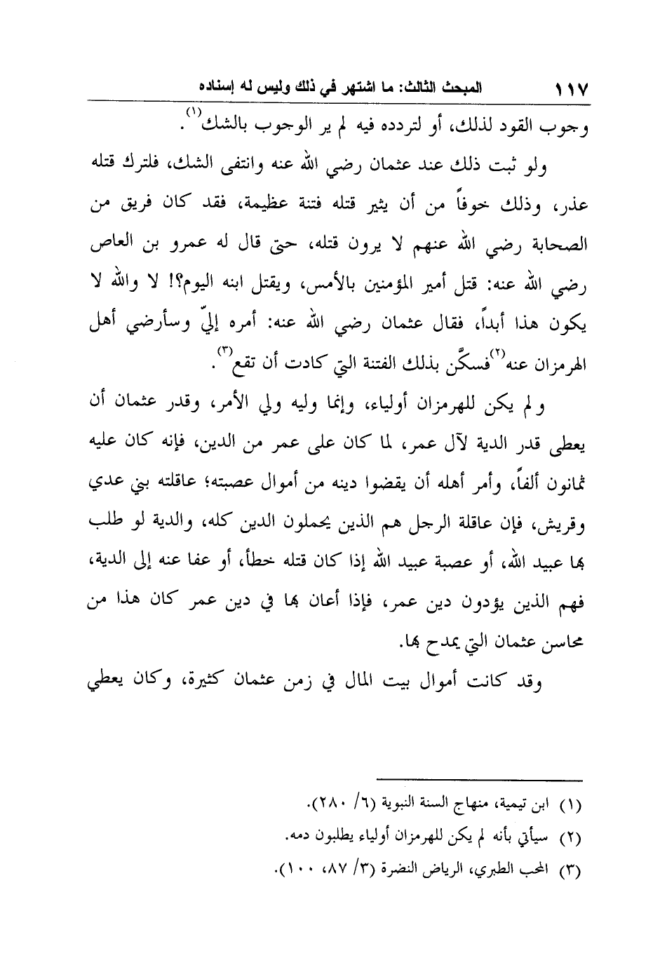 ولم يكن للهرمزان أولياء، وإنما وليه ولي الأمر، وقدر عثمان أن يعطى قدر الدية لآل عمر، لما كان على عمر من الدين، فإنه كان عليه ثمانون ألفاً، وأمر أهله أن يقضوا دينه من أموال عصبته؛ عاقلته بني عدي وقريش، فإن عاقلة الرجل هم الذين يحملون الدين كله، والدية لو طلب بها عبيد الله، أو عصبة عبيد الله إذا كان قتله خطأ، أو عفا عنه إلى الدية، فهم الذين يؤدون دين عمر، فإذا أعان بها في دين عمر كان هذا من محاسن عثمان التي يمدح بها.
