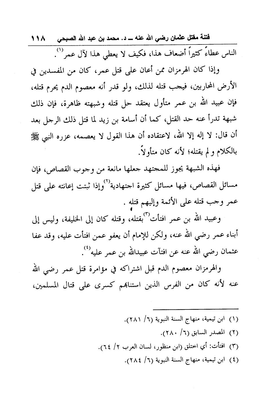 وعبيد الله بن عمر افتأت3بقتله، وقتله كان إلى الخليفة، وليس إلى أبناء عمر رضي الله عنه، ولكن للإمام أن يعفو عمن افتأت عليه، وقد عفا عثمان رضي الله عنه عن افتآت عبيد الله بن عمر عليه4.