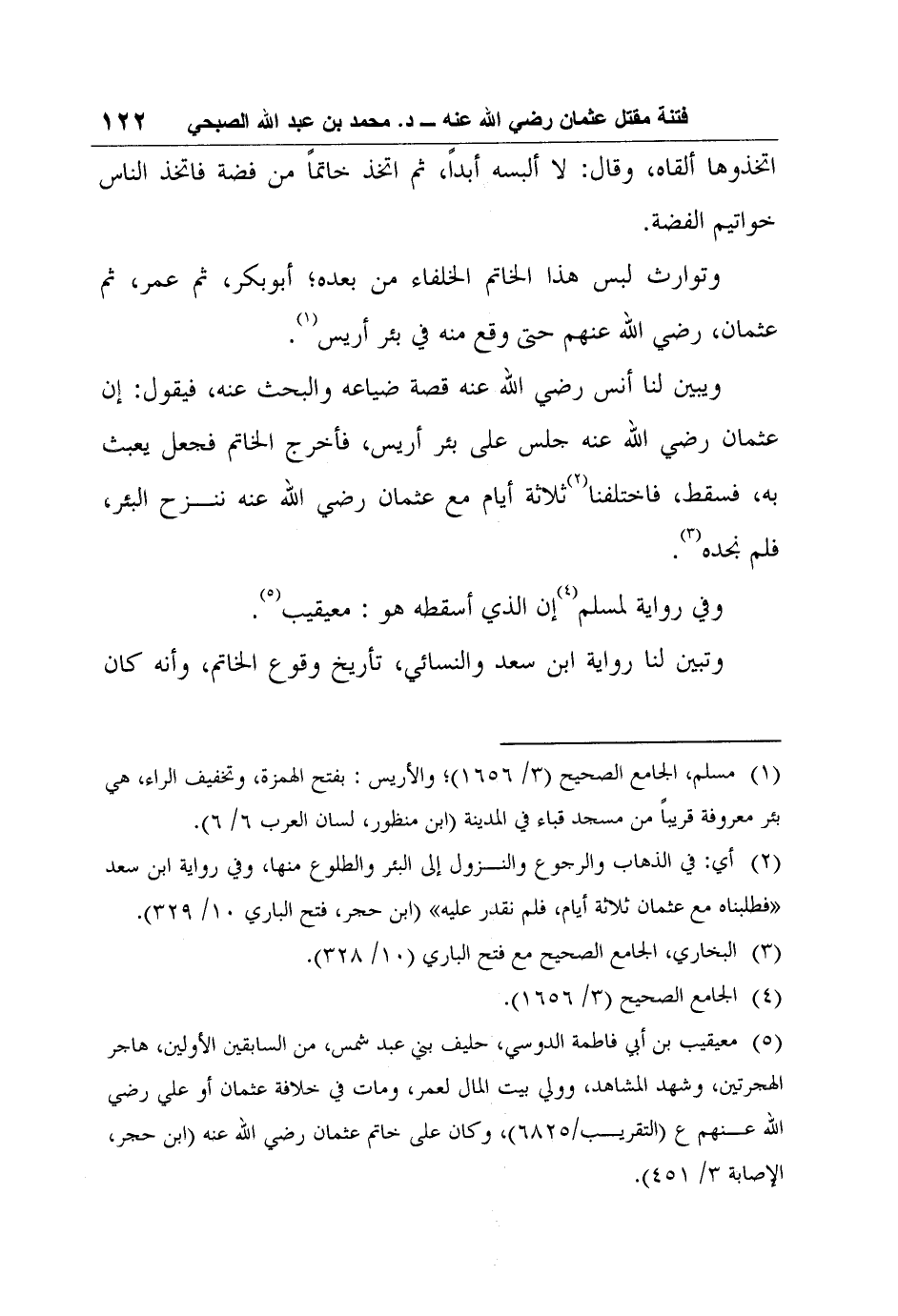 1 مسلم، الجامع الصحيح (3/ 1656) ؛ والأريس: بفتح الهمزة، وتخفيف الراء، هي بئر معروفة قريباً من مسجد قباء في المدينة (ابن منظور، لسان العرب 6/ 6) .