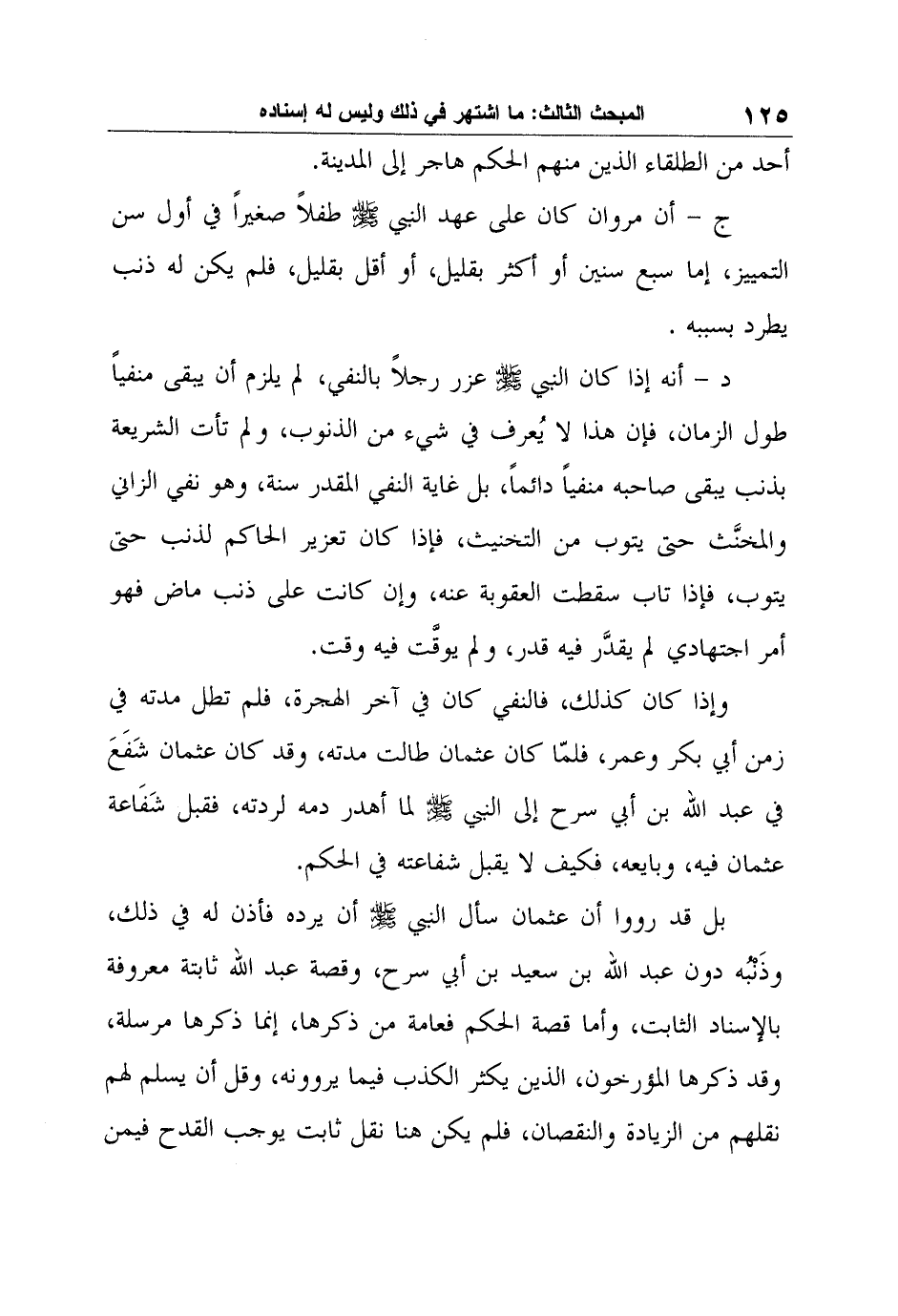 بل قد رووا أن عثمان سأل النبي صلى الله عليه وسلم أن يرده فأذن له في ذلك، وذَنْبُه دون عبد الله بن سعيد بن أبي سرح، وقصة عبد الله ثابتة معروفة بالإسناد الثابت، وأما قصة الحكم فعامة من ذكرها، إنما ذكرها مرسلة، وقد ذكرها المؤرخون، الذين يكثر الكذب فيما يروونه، وقل أن يسلم لهم نقلهم من الزيادة والنقصان، فلم يكن هنا نقل ثابت يوجب القدح فيمن