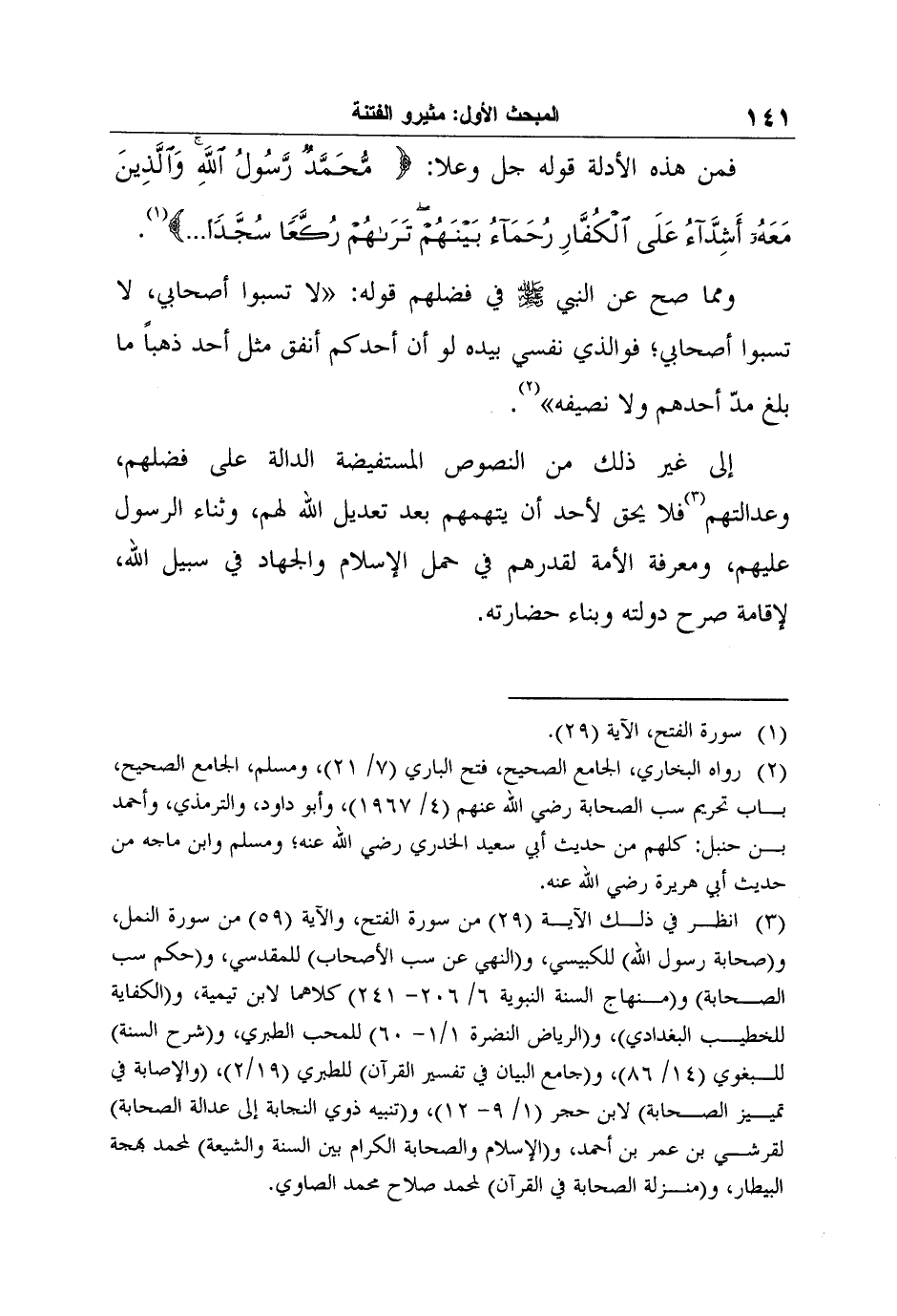 3 انظر في ذلك الآية (29) من سورة الفتح، والآية (59) من سورة النمل، و (صحابة رسول الله للكبيسي، و (النهي عن سب الأصحاب للمقدسي، و (حكم سب الصحابة) و (منهاج السنة النبوية 6/ 206- 241) كلاهما لابن تيمية، و (الكفاية للخطيب البغدادي) ، و (الرياض النضرة 1/1- 60) للمحب الطبري، و (شرح السنة للبغوي (14/ 86) ، و (جامع البيان في تفسير القرآن للطبري (19/2) ، (والإصابة في تمييز الصحابة لابن حجر (1/ 9- 12) ، و (تنبيه ذوي النجابة إلى عدالة الصحابة لقرشي بن عمر بن أحمد) ، و (الإسلام والصحابة الكرام بين السنة والشيعة لمحمد بهجة البيطار، و (منزلة الصحابة في القرآن لمحمد صلاح محمد الصاوي) .