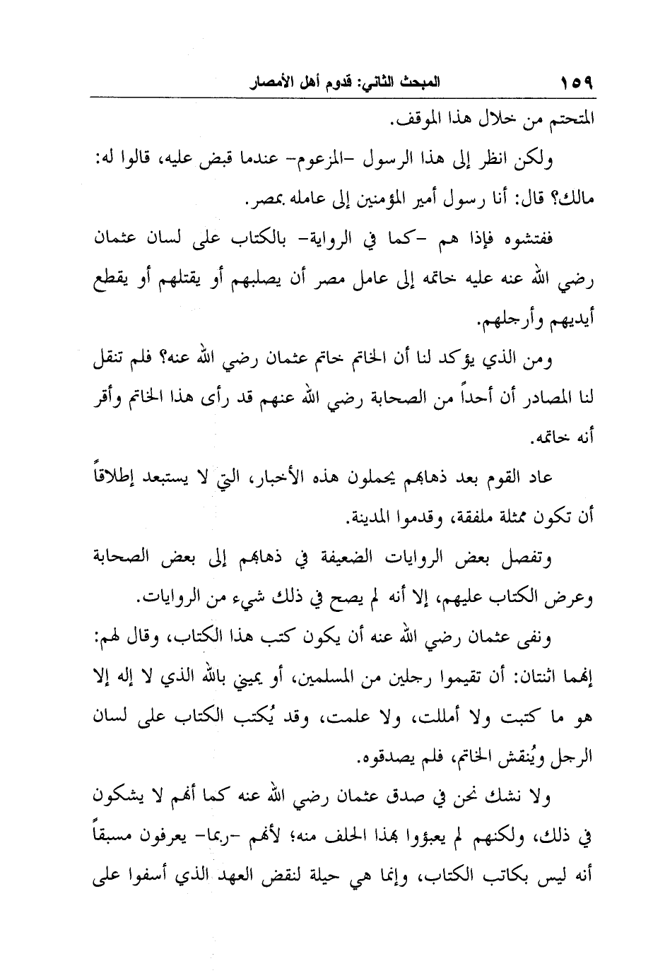 ونفى عثمان رضي الله عنه أن يكون كتب هذا الكتاب، وقال لهم: إنهما اثنتان: أن تقيموا رجلين من المسلمين، أو يميني بالله الذي لا إله إلا هو ما كتبت ولا أمللت، ولا علمت، وقد يُكتب الكتاب على لسان الرجل ويُنقش الخاتم، فلم يصدقوه.