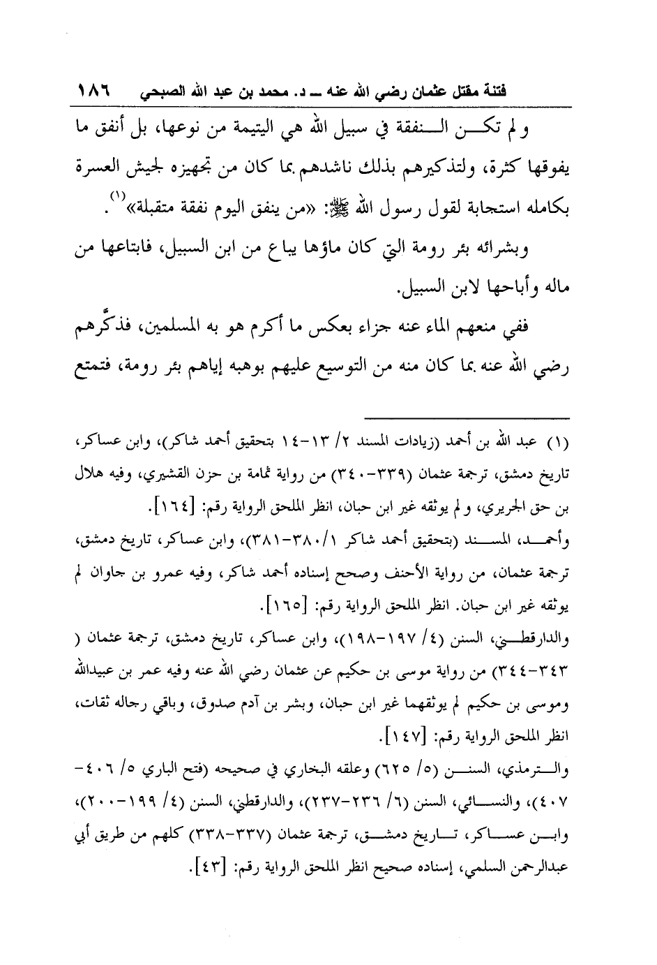 والترمذي، السنن (5/ 625) وعلقه البخاري في صحيحه (فتح الباري 5/ 406-407) ، والنسائي، السنن (6/ 236-237) ، والدارقطني، السنن (4/ 199-200) ، وابن عساكر، تاريخ دمشق، ترجمة عثمان (337-338) كلهم من طريق أبي عبد الرحمن السلمي، إسناده صحيح انظر الملحق الرواية رقم: [43] .
