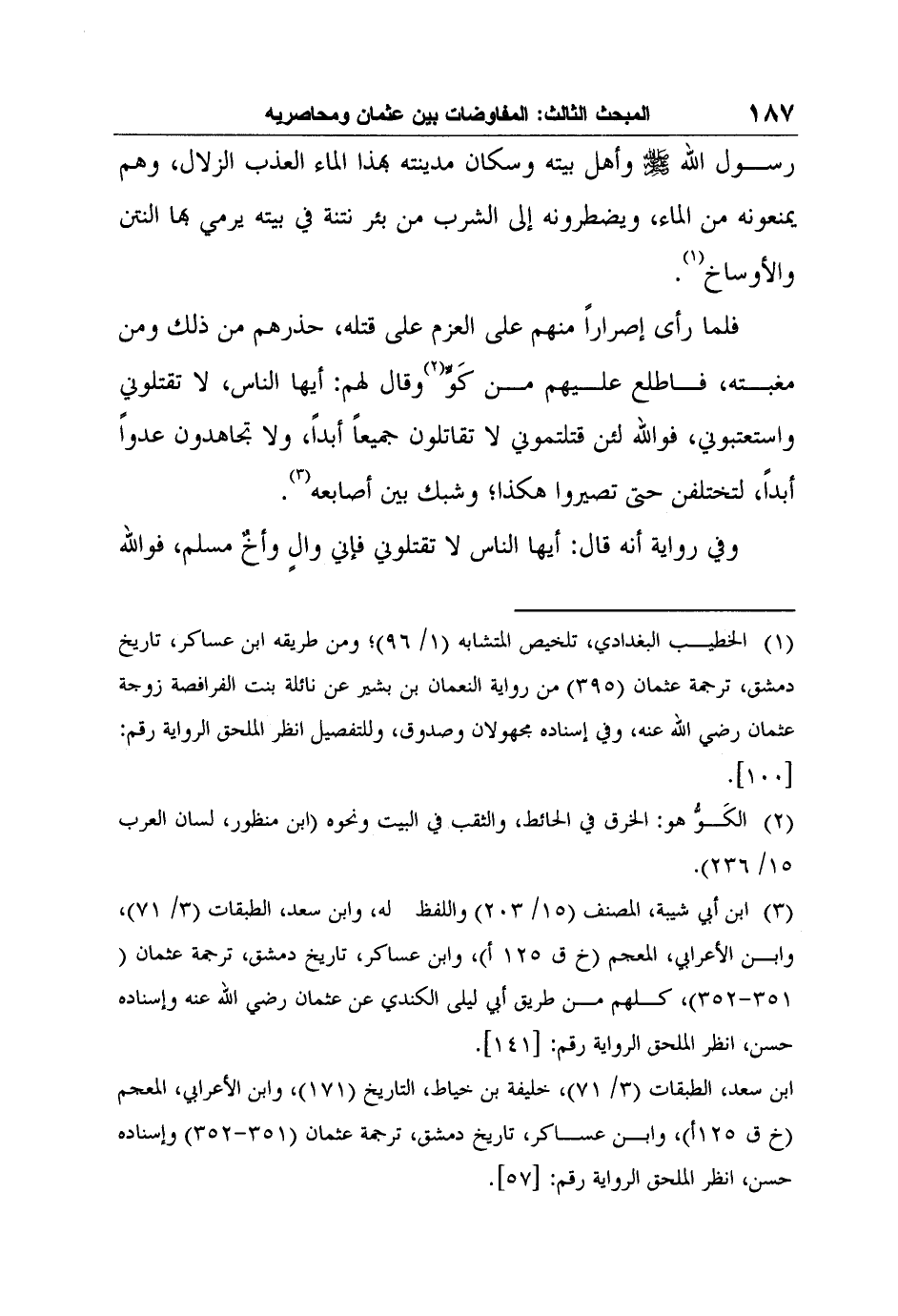 3 ابن أبي شيبة، المصنف (15/ 203) واللفظ له، وابن سعد، الطبقات (3/ 71) ، وابن الأعرابي، المعجم (خ ق 125 أ) ، وابن عساكر، تاريخ دمشق، ترجمة عثمان (351-352) ، كلهم من طريق أبي ليلى الكندي عن عثمان رضي الله عنه وإسناده حسن، انظر الملحق الرواية رقم: [141] .