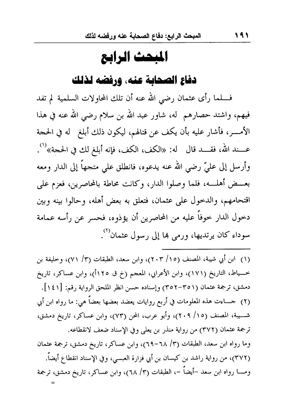 1 ابن أبي شيبة، المصنف (15/ 203) ، وابن سعد، الطبقات (3/ 71) ، وخليفة بن خياط، التاريخ (171) ، وابن الأعرابي، المعجم (خ ق 125أ) ، وابن عساكر، تاريخ دمشق، ترجمة عثمان (351-352) وإسناده حسن انظر الملحق الرواية رقم: [141] .