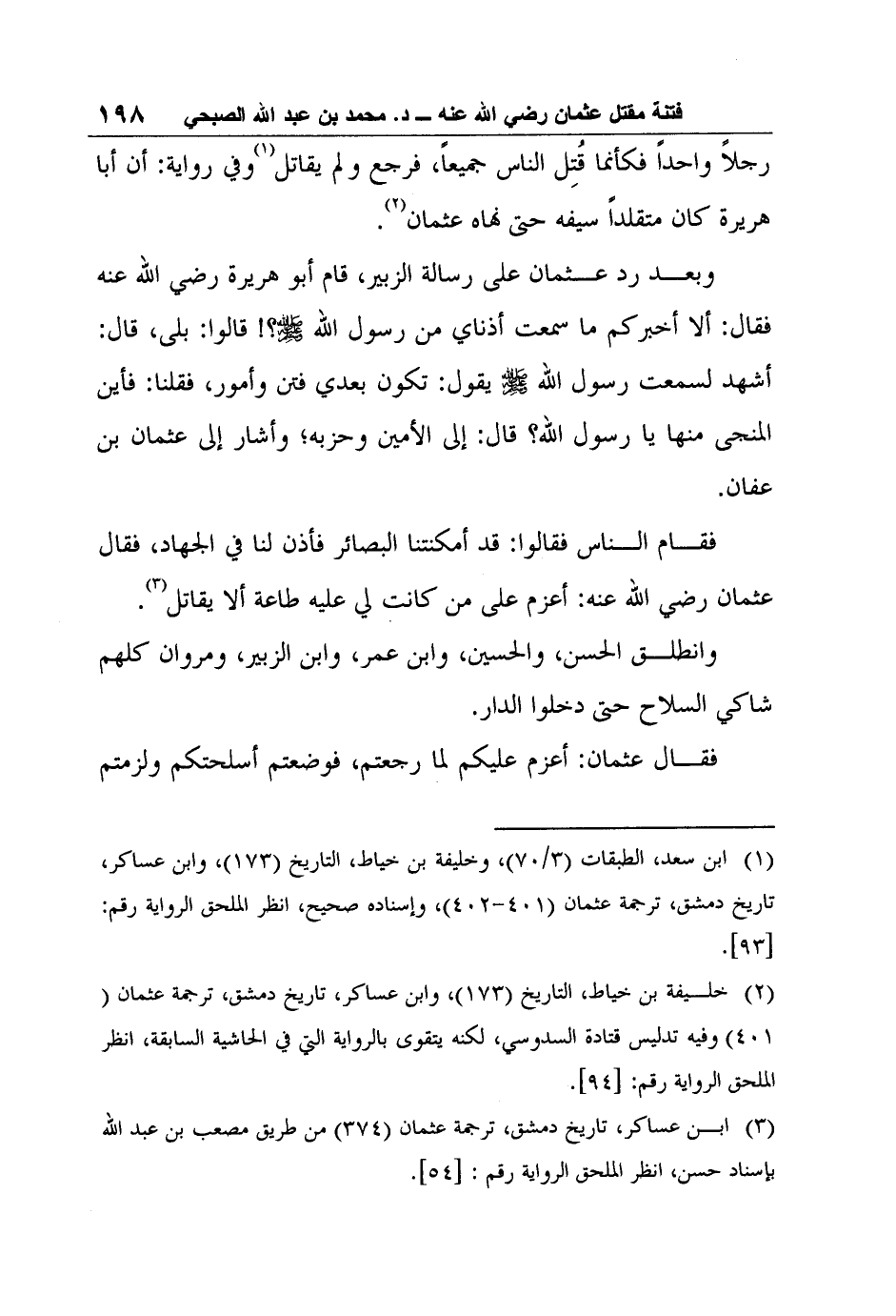 3 ابن عساكر، تاريخ دمشق، ترجمة عثمان (374) من طريق مصعب بن عبد الله بإسناد حسن، انظر الملحق الرواية رقم: [54] .