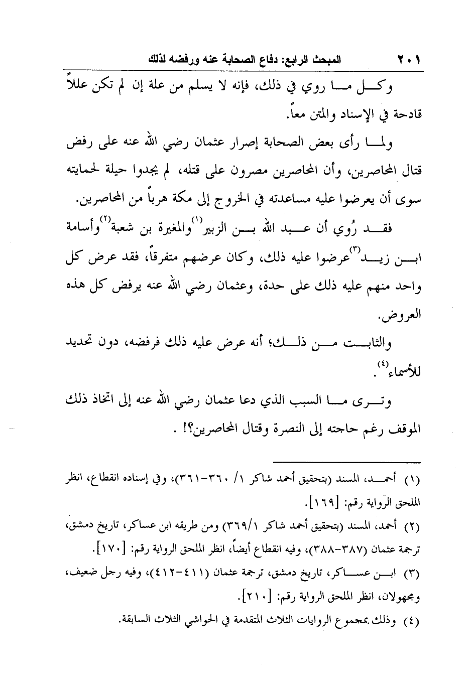 3 ابن عساكر، تاريخ دمشق، ترجمة عثمان (411-412) ، وفيه رجل ضعيف، ومجهولان، انظر الملحق الرواية رقم: [210] .
