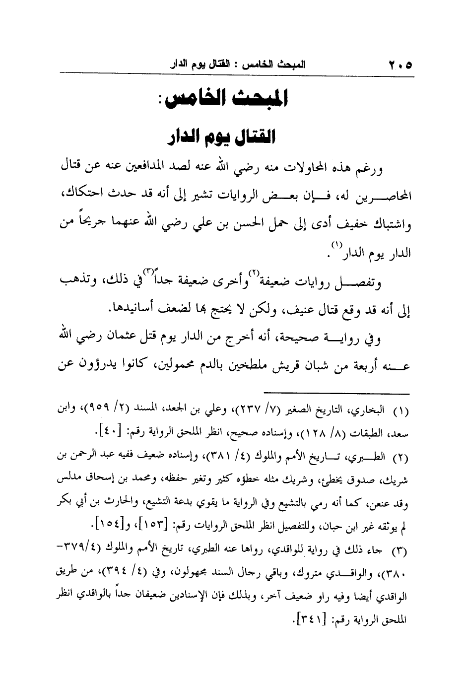 2 الطبري، تاريخ الأمم والملوك (4/ 381) ، وإسناده ضعيف ففيه عبد الرحمن بن شريك، صدوق يخطئ، وشريك مثله خطؤه كثير وتغير حفظه، ومحمد بن إسحاق مدلس وقد عنعن، كما أنه رمي بالتشيع وفي الرواية ما يقوي بدعة التشيع، والحارث بن أبي بكر لم يوثقه غير ابن حبان، وللتفصيل انظر الملحق الروايات رقم: [153] ، و [154] .
