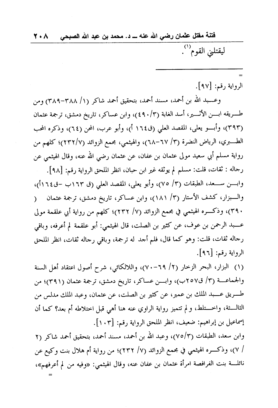 1 البزار، البحر الزخار (2/ 69-70) ، واللالكائي، شرح أصول اعتقاد أهل السنة والجماعة (3/ ق257ب) ، وابن عساكر، تاريخ دمشق، ترجمة عثمان (391) ؛ من طريق عبد الملك بن عمير، عن كثير بن الصلت، عن عثمان، وعبد الملك مدلس من الثالثة، واختلط، ولم تتميز رواية الراوي عنه هنا أهي قبل اختلاطه أم بعد؟ كما أن إسماعيل بن إبراهيم: ضعيف، انظر الملحق الرواية رقم: [103] .