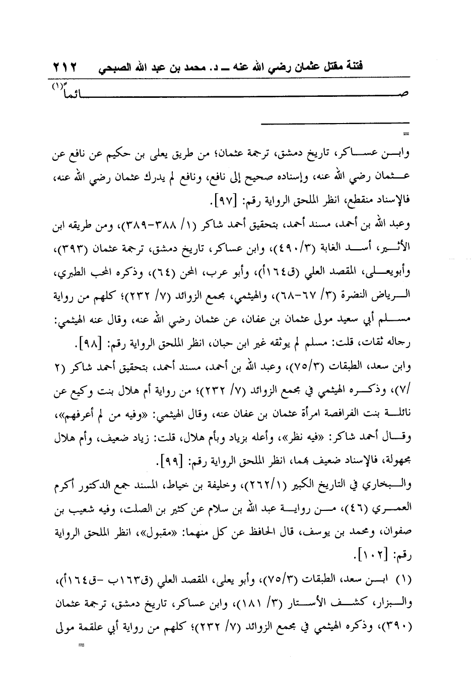 1 ابن سعد، الطبقات (3/75) ، وأبو يعلى، المقصد العلي (ق163ب -ق164أ) ، والبزار، كشف الأستار (3/ 181) ، وابن عساكر، تاريخ دمشق، ترجمة عثمان (390) ، وذكره الهيثمي في مجمع الزوائد (7/ 232) ؛ كلهم من رواية أبي علقمة مولى عبد الرحمن بن عوف، عن كثير بن الصلت، قال الهيثمي: أبو علقمة لم أعرفه، وباقي رجاله ثقات، قلت: وهو كما قال، فلم أجد له ترجمة، وباقي رجاله ثقات، انظر الملحق الرواية رقم: [97] .