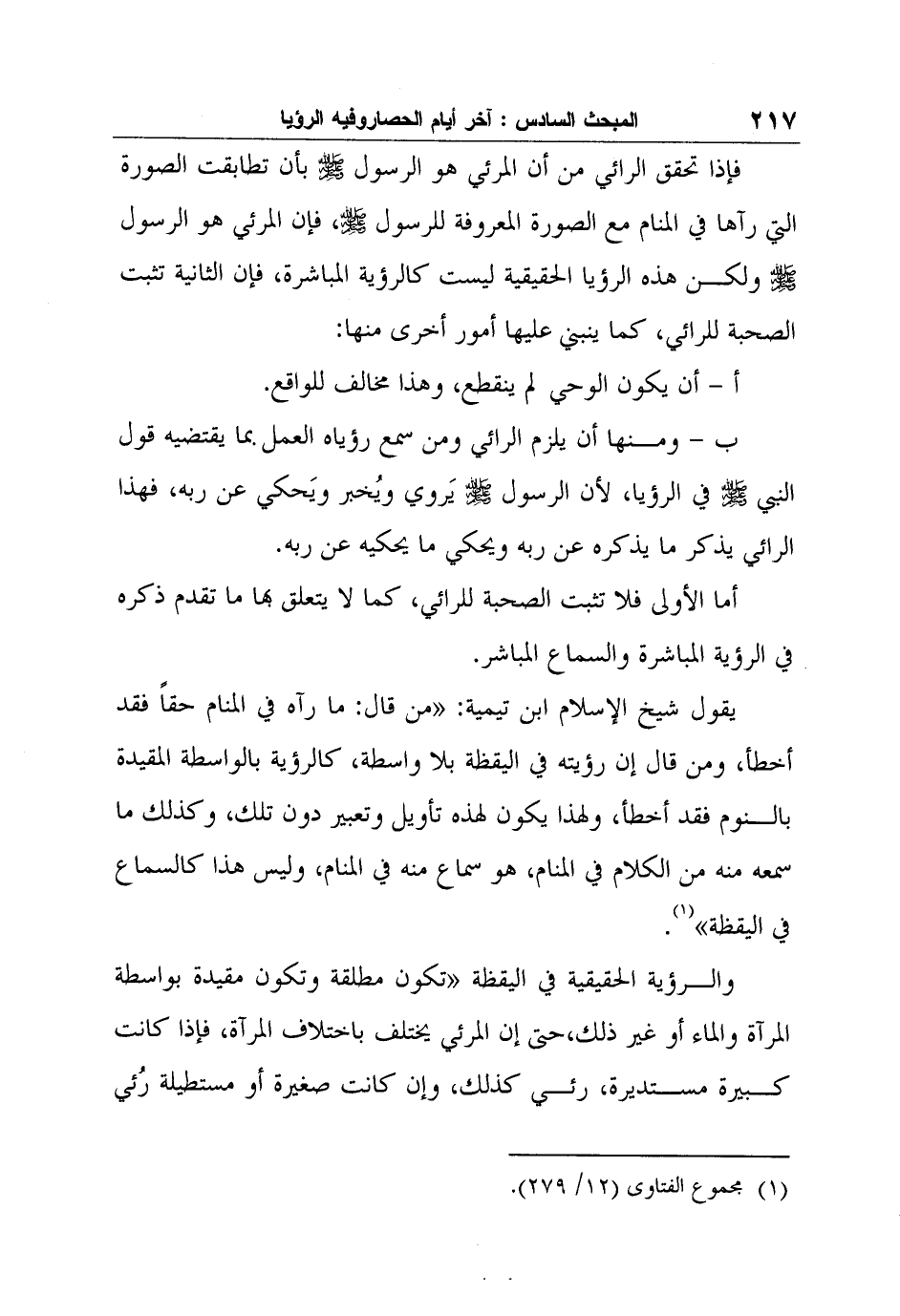 يقول شيخ الإسلام ابن تيمية: "من قال: ما رآه في المنام حقاً فقد أخطأ، ومن قال إن رؤيته في اليقظة بلا واسطة، كالرؤية بالواسطة المقيدة بالنوم فقد أخطأ، ولهذا يكون لهذه تأويل وتعبير دون تلك، وكذلك ما سمعه منه من الكلام في المنام، هو سماع منه في المنام، وليس هذا كالسماع في اليقظة"1.