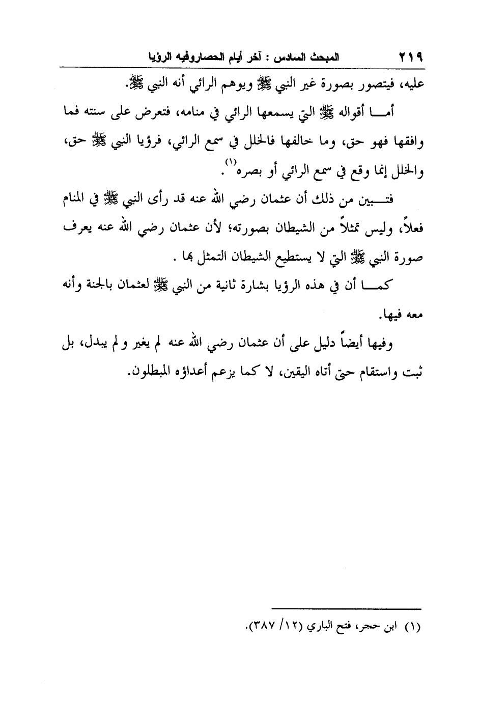 فتبين من ذلك أن عثمان رضي الله عنه قد رأى النبي صلى الله عليه وسلم في المنام فعلاً، وليس تمثلاً من الشيطان بصورته؛ لأن عثمان رضي الله عنه يعرف صورة النبي صلى الله عليه وسلم التي لا يستطيع الشيطان التمثل بها.