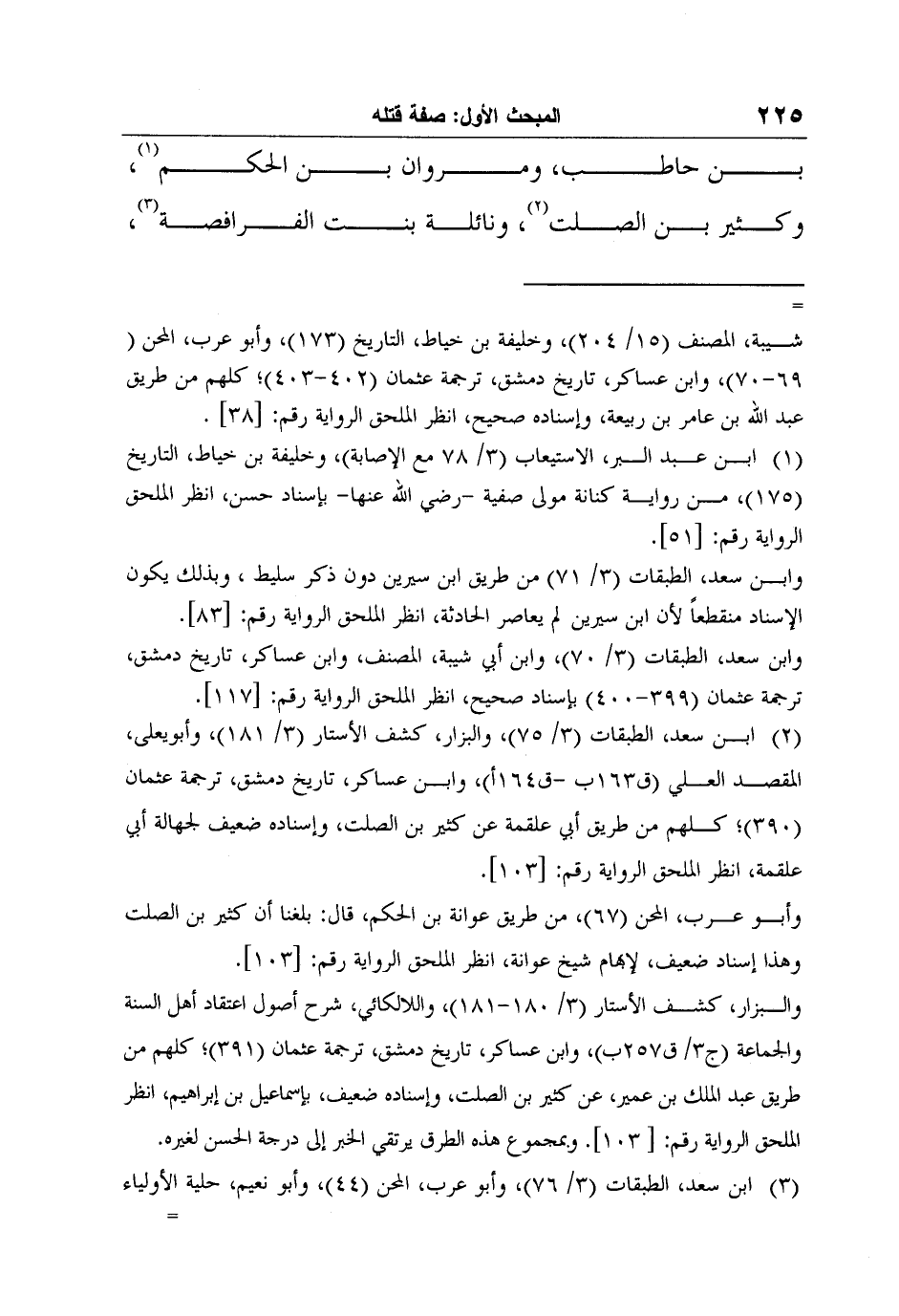 1 ابن عبد البر، الاستيعاب (3/ 78 مع الإصابة) ، وخليفة بن خياط، التاريخ (175) ، من رواية كنانة مولى صفية -رضي الله عنها- بإسناد حسن، انظر الملحق الرواية رقم: [51] .